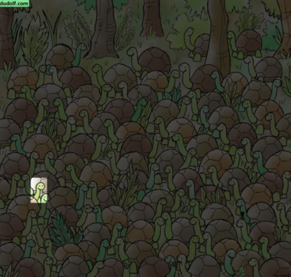 Mađarski ilustrator crtanih filmova Gergely Dudas već je dobro poznat na društvenim mrežama, pod nadimkom Dudof, jer često objavljuje razne zagonetke i mozgalice kako bi zabavio svoje pratitelje. The Sun je prenio jednu takvu, a zadatak je pronaći zmiju u moru kornjača. Jel je vidite?