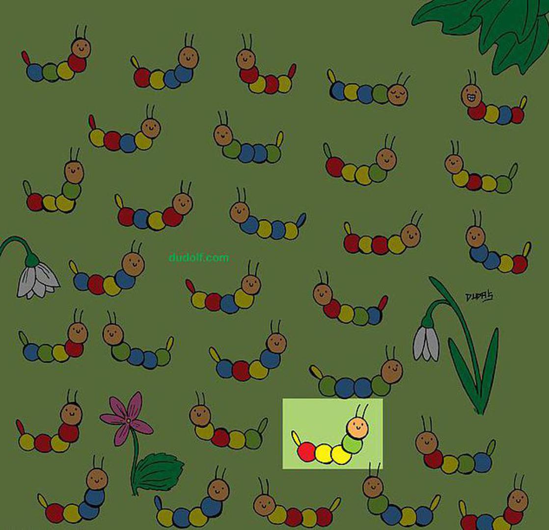 Došlo je proljeće, dani su sve duži, a ova prigodna mozgalica slavi svu ljepotu ovog godišnjeg doba. Mađarski umjetnik Gergely Dudas, poznatiji kao Dudolf, kreirao je zanimljiv izazov inspiriran toplijim mjesecima. Samo jedna od ovih gusjenica nema odgovarajući par, kako piše Daily Mail. Dakle, možete li pronaći jedinu gusjenicu koja je sasvim jedinstvena? Da biste pronašli koju gusjenicu koja ima jedinstveni uzorak u boji, trebate upariti sve gusjenice i onda će vam ostati ona koja se ne podudara. Mučite se? Skrenite pažnju na dno ilustracije i pobliže pogledajte gusjenice koje se nalaze na njemu.