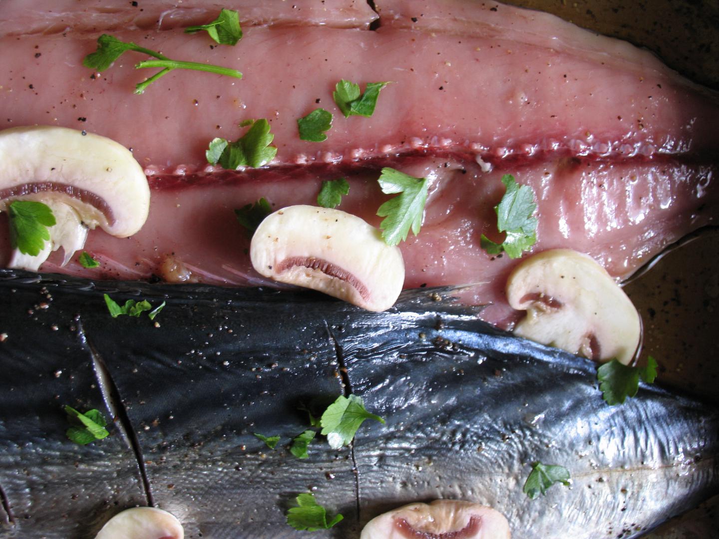 Filetirajte uzdužno 1 palamidu od oko ¾ kg pa joj uklonite sve kosti i nečist iz trbušne šupljine. Potopite je preko noći u mješavinu od po 1 čaše vinske kvasine i crnog vina. Prije služenja malo isperite ribu, a onda je pospite sjeckanim petrusimulom ili peršinom. Posolite, dobro popaprite pa podlijte 1 čašom maslinova ulja te 1 žlicom kvasine. Služite s desetak sirovih šampinjona izrezanih na ploške, koje prethodno ipak malo ostavite da stoje u šugu od riblje marinade. Moj osobni recept.