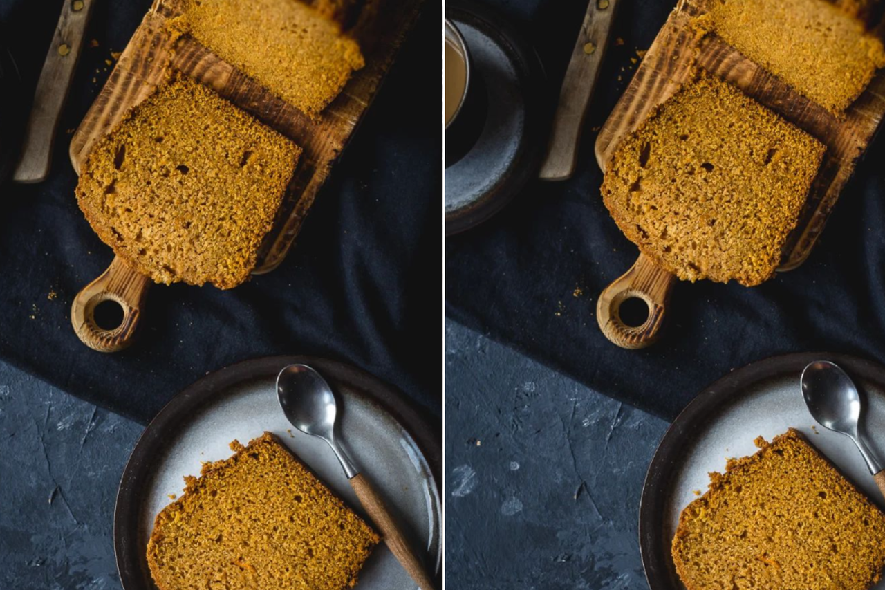 Priprema: Bundevu ispecite u pećnici ili prokuhajte u malo vode. Ako se odlučite za pečenje, ohlađenu bundevu izmiksajte uz malo vode kako biste dobili glatki pire. Izmjerite potrebnu količinu za kruh. Uključite pećnicu na 180 °C. Pripremite pleh veličine 30 x 11 cm tako da ga obložite papirom za pečenje. U zdjeli pomiješajte brašno, cimet, đumbir, muškatni oraščić, sodu bikarbonu i sol.