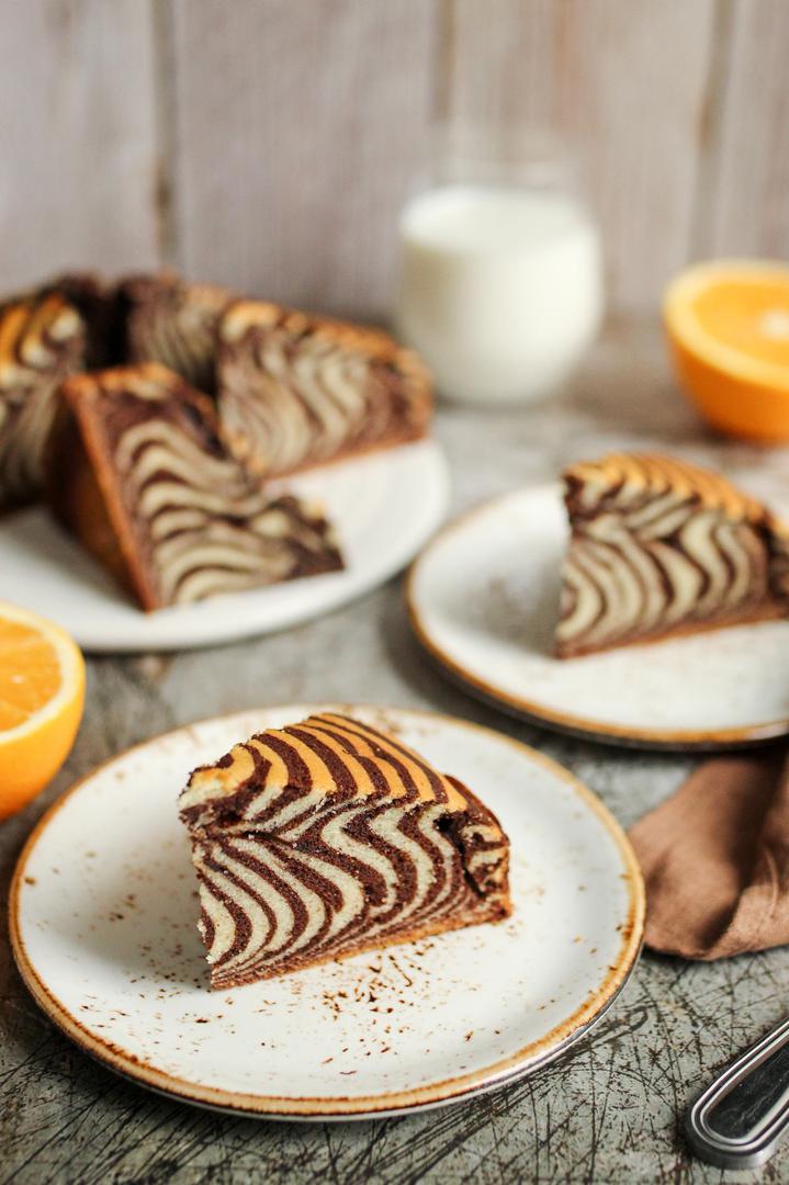 Priprema: U većoj zdjeli pjenjačom ručno izmiješajte jaja, šećer, mlijeko i ulje dok ne dobijete glatku i jednoličnu smjesu. Mikser nije potreban – čak je i poželjno izbjeći ga kako bi torta ostala fine, kompaktne strukture. Dobivenu smjesu podijelite na dva jednaka dijela. U prvu zdjelu dodajte 175 g prosijanog brašna, pola praška za pecivo i aromu vanilije. Sve dobro izmiješajte žicom dok ne dobijete glatku, svijetlu smjesu. U drugu zdjelu dodajte 125 g prosijanog brašna pomiješanog s kakaom, drugu polovicu praška za pecivo i naribanu koricu naranče. Ovaj dodatak nije obavezan, ali daje torti posebno ugodan miris i svježinu. Dobro promiješajte do ujednačene tamne smjese. Savjet: Provjerite jesu li obje smjese slične gustoće. Ako vam se jedna čini gušća, dodajte nekoliko kapi mlijeka – važno je da se obje smjese jednako razlijevaju kako bi se dobio lijep zebra-uzorak.