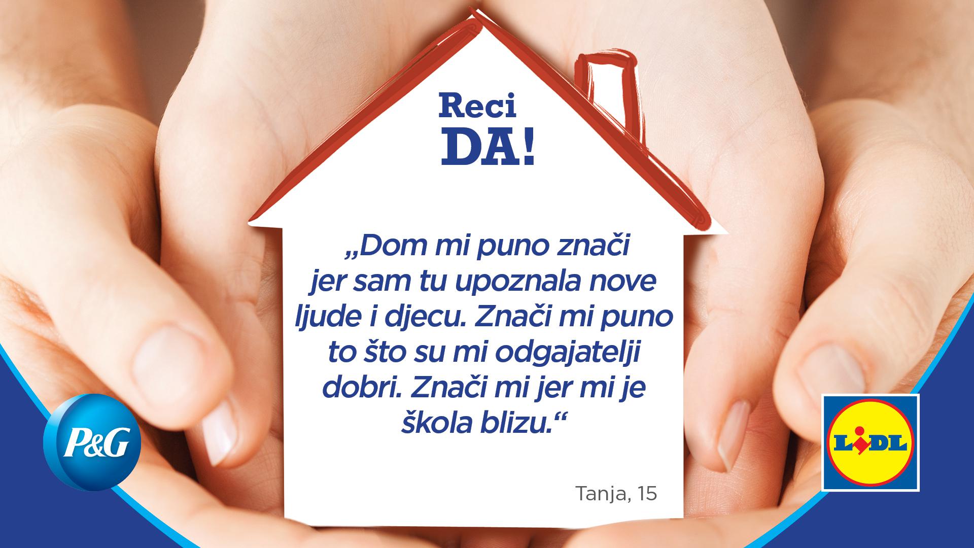 „Tvrtke P&G i Lidl Hrvatska s ponosom nastavljaju donacijsku kampanju „Reci DA!“ i vjerujemo da ćemo zajednički omogućiti djeci ugodnije odrastanje i ljepšu svakodnevicu. U planiranje i usklađivanje su od samog početka uključeni ravnatelji svih četiriju doma, te Ministarstvo socijalne politike i mladih koje je izrazilo potporu i omogućilo nam uspješnu suradnju s domovima. Podrška Ministarstva socijalne politike i mladih nam je iznimno značajna jer je prepoznata naša želja da djeci omogućimo sretnije djetinjstvo i na taj način im pružimo priliku za bolju budućnost. Sigurni smo da ćemo na kraju kampanje „Reci DA!“ poboljšati život djece smještene u domovima te im na taj način poručiti da mislimo na njih i želimo im što ljepše odrastanje“, izjavila je direktorica P&G Hrvatska, Lana Zanne Latos.