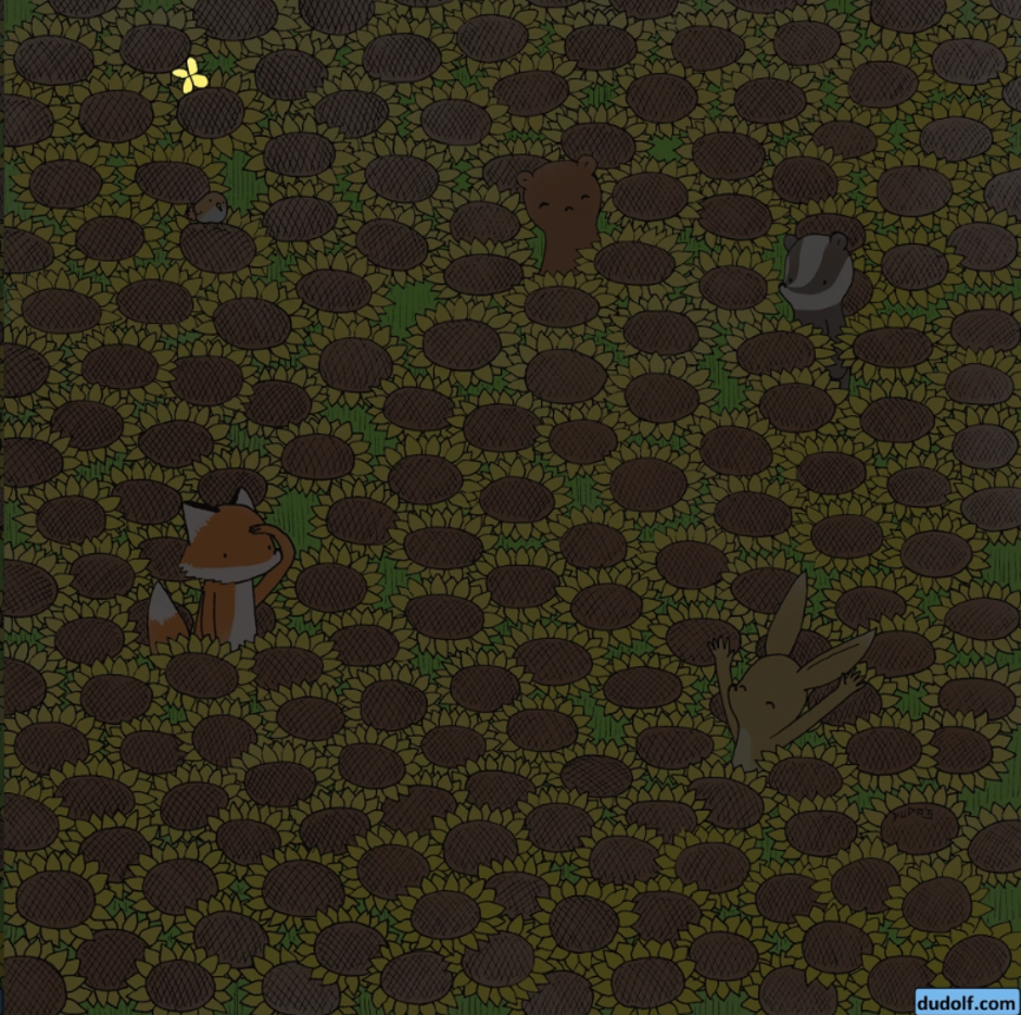 Mađarski umjetnik Gergely Dudás, koji često dijeli zagonetke na svom blogu i u svojim knjigama, izaziva vas da uočite leptira na ovoj ilustraciji. Na ilustraciji je prikazano polje suncokreta s nekoliko slatkih životinja u lovu na istog insekta, prenosi The Sun.