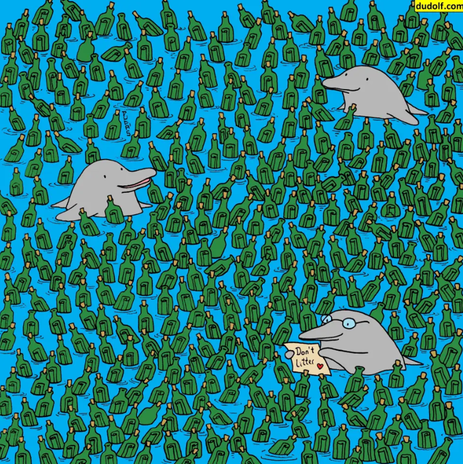 Da bi bilo teže, boce su sve zajedno i cijeli je prizor, osim dupina, obojen u zeleno i plavo. Jedan od delfina može se vidjeti kako nosi naočale i čita jednu od bilješki iz boce u lijepom komičnom prizvuku. Poruka unosi dodatno značenje u sliku jer glasi "ne bacaj smeće", potičući igrače da bolje brinu o okolišu.