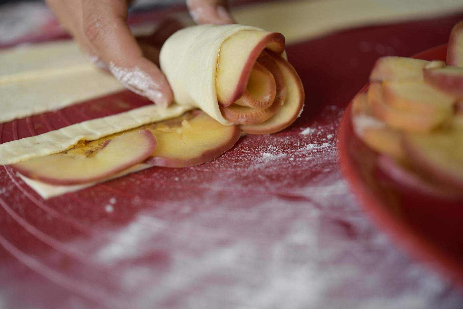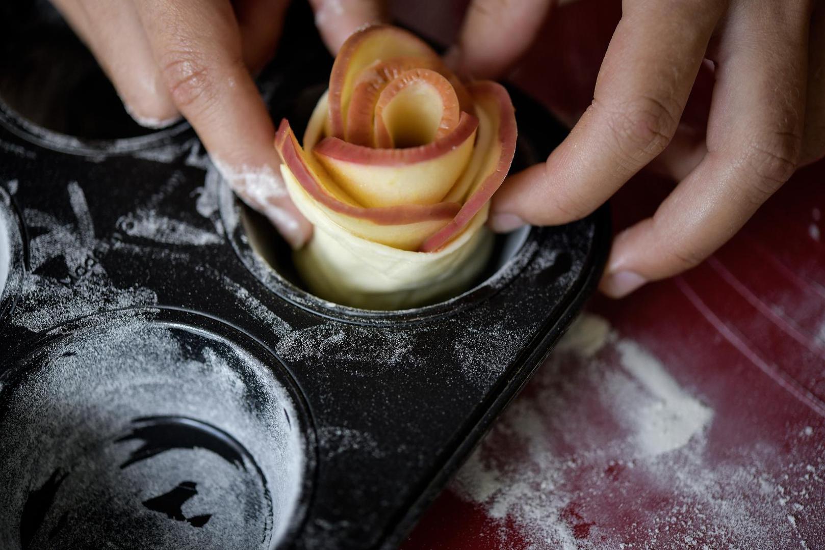 Jabuke prepolovite, očistite i narežite na ploške od peteljke do kraja. Ploške stavite u vodu i limunov sok i kuhajte dok tekućina ne zakipi. Lisnato tijesto razvaljajte u oblik pravokutnika pa izrežite 6 jednakoih traka. Svaku traku premažite domaćim džemom od marelica, pospite cimetom i na gornji kraj poslažite jabuke. Donji kraj presavinite kako pekmez ne bi iscurio tijekom pečenja pa zarolajte u oblik ružice. Stavite u namašćeni kalup za pečenje muffina i pecite u prethodno zagrijanoj pećnici na 190 stupnjeva 40 minuta.