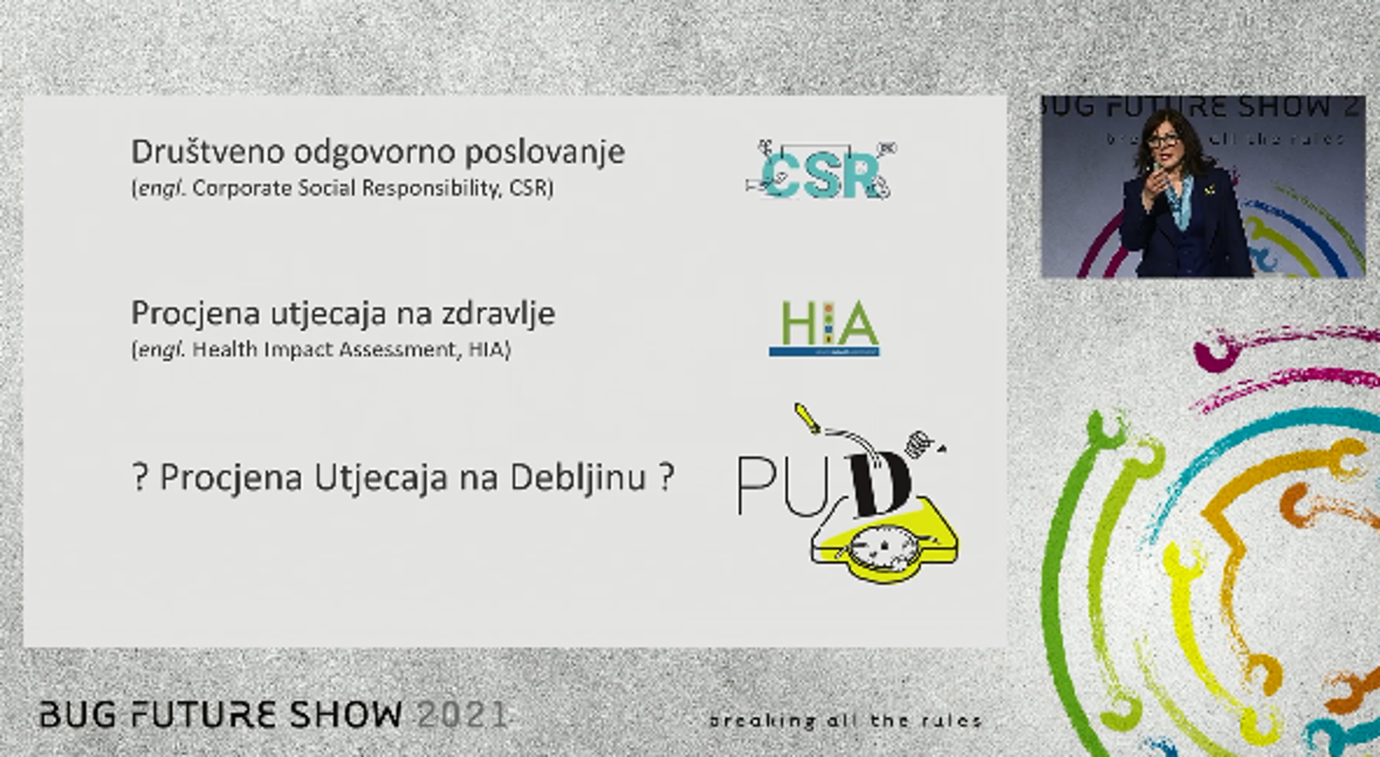 Sanja Musić Milanović jedna je od tri key note predavača na konferenciji Bug Future Show 2021. Voditeljica projekta "Živjeti zdravo" na predavanju je govorila na temu "Što kaže vaša vaga? - Prevencija debljine 2.0". Naime, prema posljednjim procjenama, prekomjerna tjelesna masa u sljedećih će 30 godina dovesti do skraćenja trajanja života za 3,5 godine i do pola milijuna slučajeva nezaraznih bolesti.