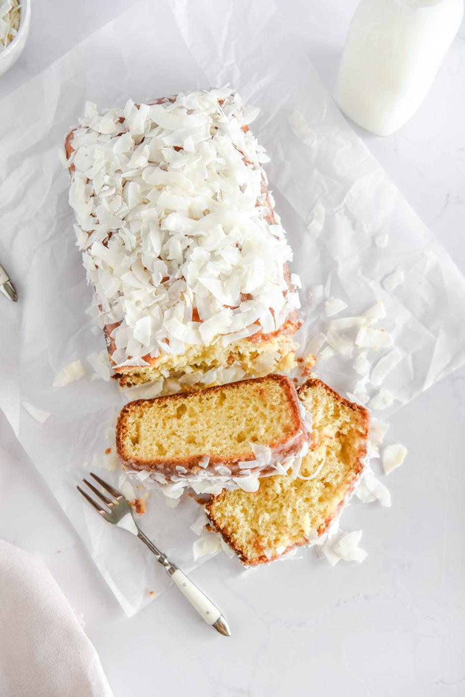 Pećnicu ugrijte na 180 stupnjeva. Pripremite kalup za kruh približnih dimenzija 12 x 28 cm. Dno kalupa obložite papirom za pečenje te rubove namastite. U posudi pomiješajte brašno, prašak za pecivo, sol te mljeveni kokos te stavite po strani. U posudi od električnog miksera ili običnoj posudi pomiješajte jaja, šećer, jogurt te ulje. Možete koristiti pjenjaču pa ručno pomiješati sastojke ili pjenjačom ili metlicama miksera pomiješati mokre sastojke. Sada dodajte suhe sastojke pa sve povežite špatulom ili mikserom. Pripremljenu smjesu istresite u kalup, špatulom poravnajte površinu. Pecite 35- 40 minuta, odnosno dok čačkalica zabodena u sredinu ne izađe suha. Kolač ostavite u kalupu  minudesetakta pa ga prebacite na rešetku za hlađenje dok se potpuno ne ohladi.