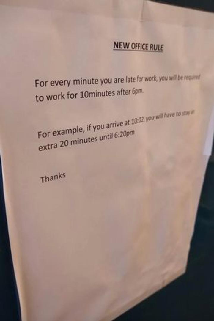 Međutim, kako piše Mirror, jedan šef i takvo manje kašnjenje shvaća vrlo ozbiljno pa svoje zaposlenike ako zakasne i jednu minutu strogo kažnjava. To je podijelio jedan bivši član osoblja, koji je i slikao natpis s oštrim pravilom.
