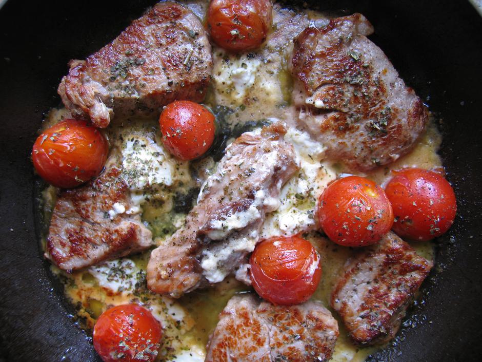 Izrežite na deblje ploške 1 kg telećeg ombula ili filea i prepecite na naglo s obje strane na 5 dag maslaca rastopljenog u 1 dl maslinova ulja. Kad se meso zazlatilo s obje strane, a iznutra ostalo ružičasto, ubacite 10 malih pomidora (rajčica; tada još nisu stigle na ferarski dvor) i 15 dag na kocke narezane gorgonzole ili roqueforta. Pustite da se još malo prepeče, pa posolite, popaprite i pospite s 2 prstohvata majčine dušice. Recept prema renesansnom uzoru