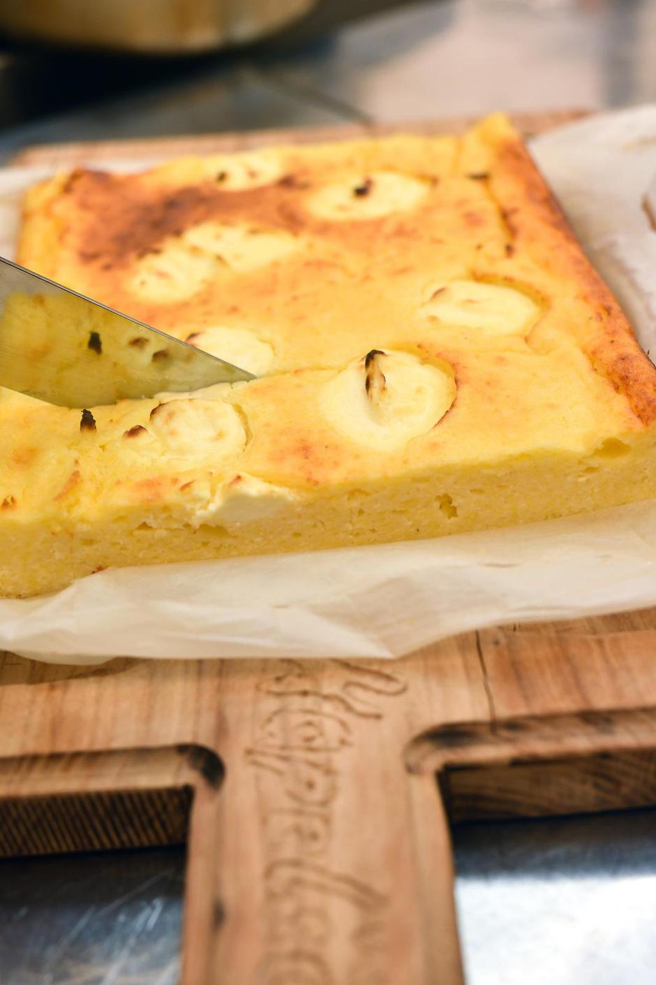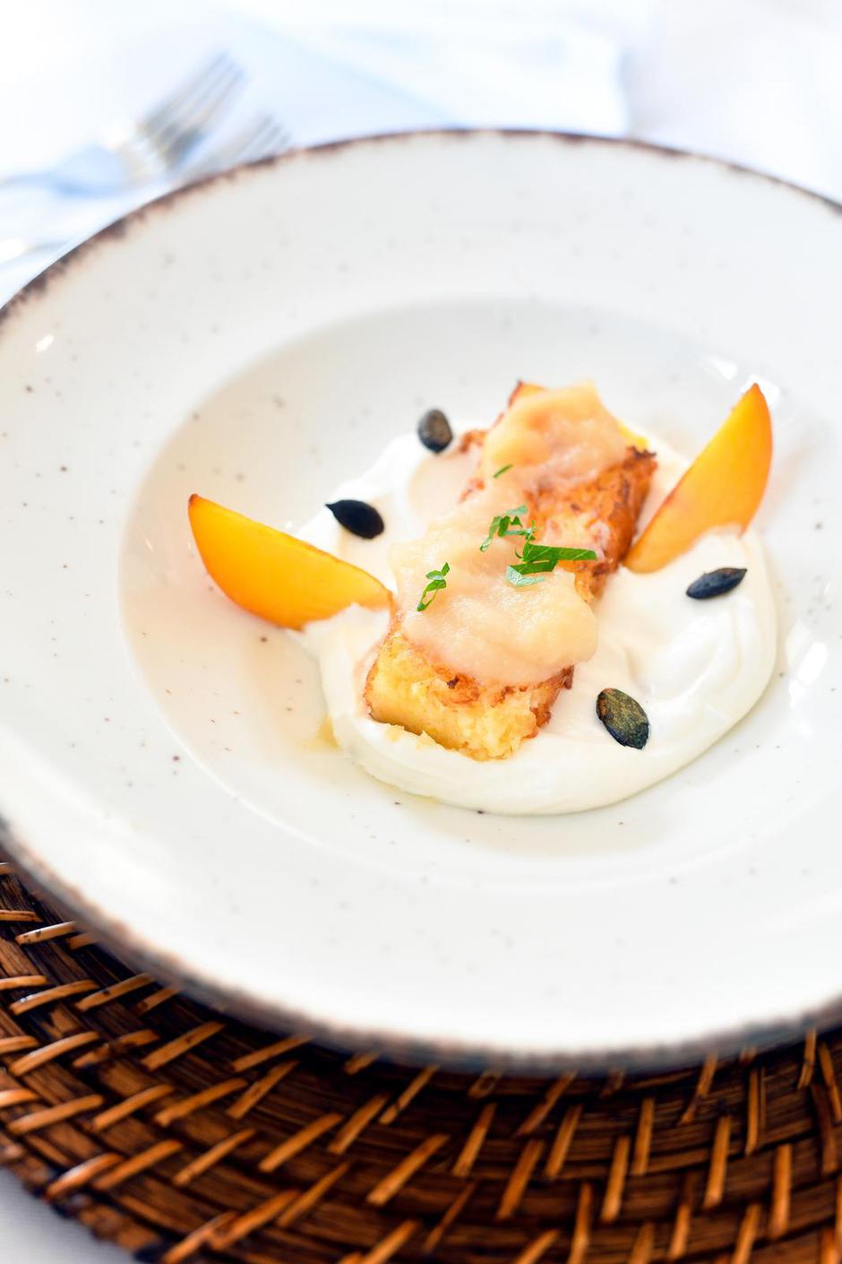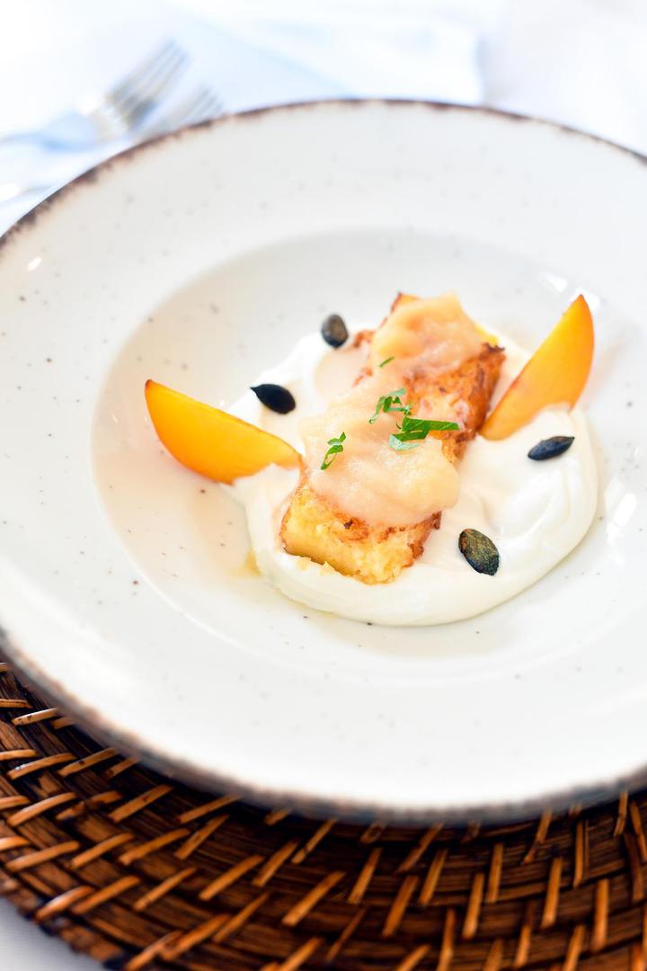 Zagrijte pećnicu na 180 stupnjeva. Pomiješajte jaja i šećer. U smjesu dodajte sve preostale sastojke osim kiselog vrhnja. Izlijte smjesu u lim/GN posudu, koji ste prethodno premazali maslacem. Uzmite žlicu po žlicu kiselog vrhnja i lagano stavljajte na smjesu koju ste izlili u lim. Pecite u prethodno zagrijanoj pećnici oko 25-35 minuta, ovisno o veličini posude i visini kolača. Zlevka mora izvana dobiti lijepu zlatno-smeđu boju. Kad se ohladi, režemo je na pravokutne komade i pečemo na „putru“ da dobije zlatnu, lagano zapečenu boju zbog okusa. U sredinu tanjura dodajte kremu (protisnut svježi sir, kiselo vrhnje i malo tučenog slatkog vrhnja koje smo pomiješali s bagremovim medom). Dekorirajte svježom breskvom, melisom i pireom od jabuka (jabuke ogulite, režite na 1/4 i izvadite koštice pa ih kuhajte u slatkoj vodi, a kad je gotovo, ohladite u istoj vodi i potom samo jabuke dobro sjedinite blenderom da dobijete neodoljiv pire).