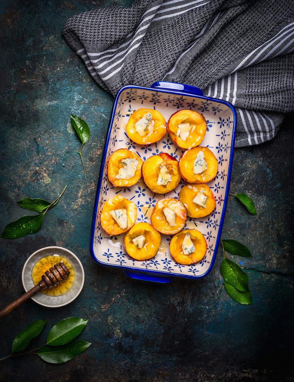 Breskve narežite na polovice i izvadite koštice. Premažite mješavinom meda, đumbira i dvije žlice limunova soka. Na grill tavi rastopite maslac pa pecite polovice bresaka sa svake strane oko dvije minute. Zgnječite papar, pomiješajte ga s malo limunove korice i dodajte breskvama. Istucite žumanjca sa šećerom na pari, a pretkraj dodajte i rum. Nakapajte breskve kremom s rumom i ukrasite kuglom sladoleda. Pospite preostalom limunovom koricom i šećerom u prahu.