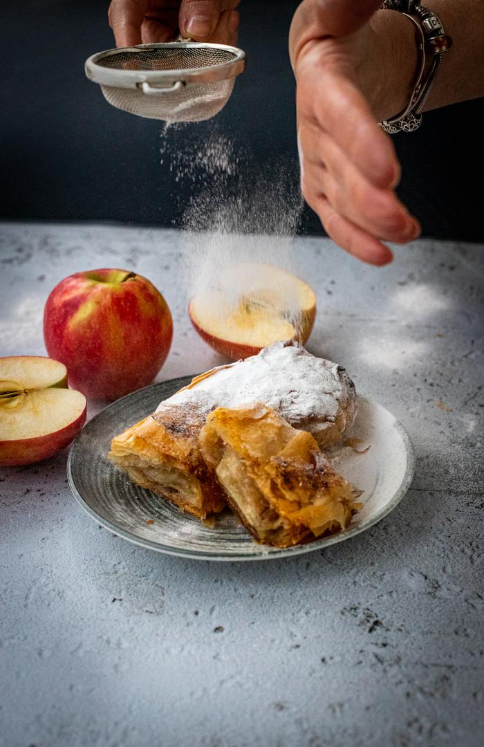Ovaj recept nije točan. 1. nedostaje sol u tijestu, a sol ga čini rastezljivim. 2. Nedostaje cimet, limunov sok i vanilija u nadjevu, što nadjev čini ukusnijim i s čime neće oksidirati boja jabuka. Da me Večernji hoće zaposliti, napisao bi vam recepte koji su čista senzacija, od prozirne pite od dunja na dalje.