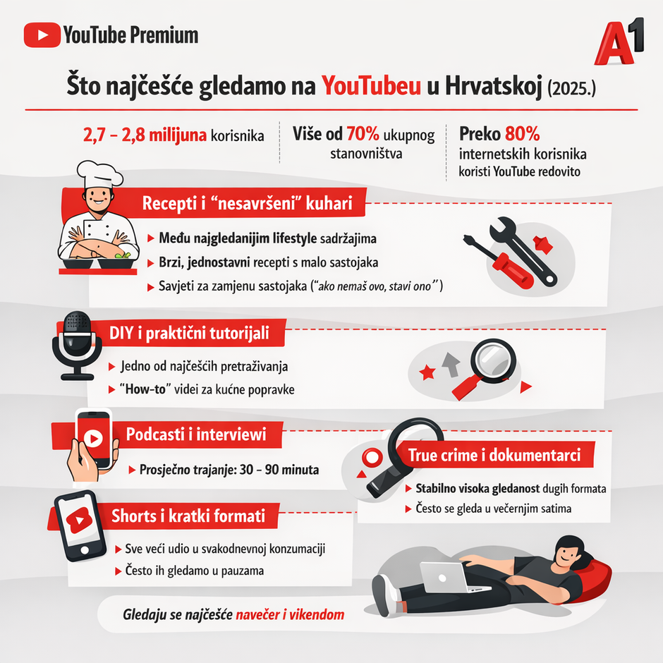 U Hrvatskoj YouTube danas koristi oko 2,7 do 2,8 milijuna ljudi, što je preko 80% internetskih korisnika. No, važnije od same brojke je činjenica da ga Hrvati koriste kao multiformatnu platformu koja se prilagođava nama, a ne obrnuto.