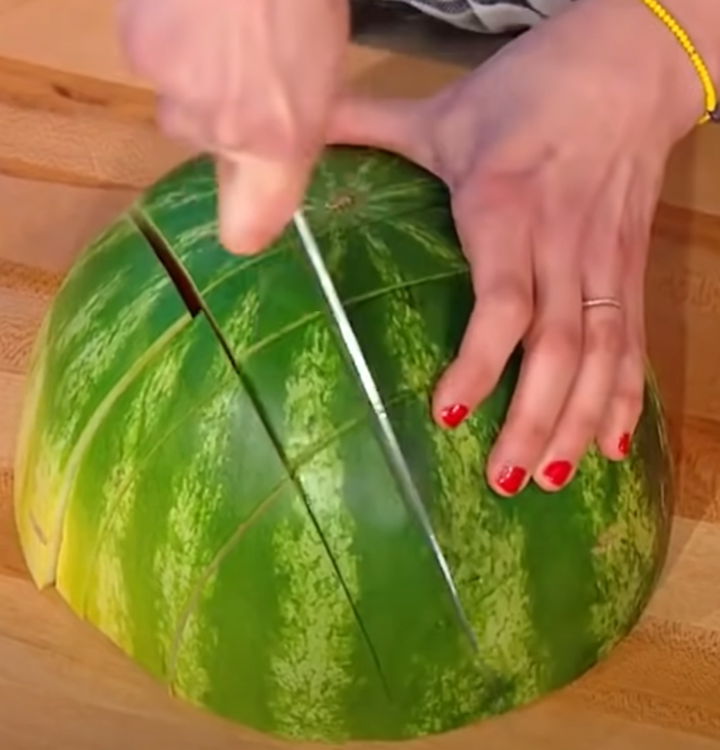 Kako narezati lubenicu? Za jednostavnije jedenje lubenice, prerežite je okomito popola. Svaku polovicu stavite na dasku te koru zarežite u obliku mreže