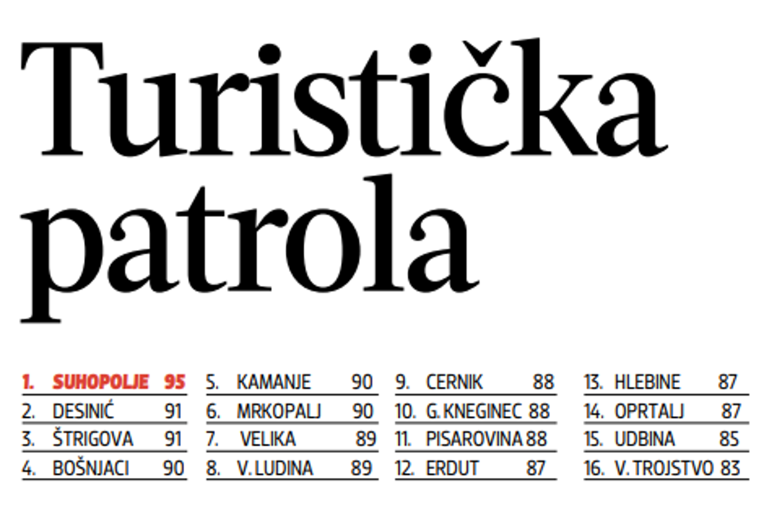 Na tome smo putu bilježili ocjene za svako mjesto i, naposljetku, kada smo zbrojili sve bodove, u konkurenciji između šesnaest destinacija na kontinentu šampionsku titulu ove je godine odnijelo Suhopolje, mjesto desetak kilometara udaljeno od županijskog središta Virovitice. Od mogućih stotinu Suhopolje je za urednost, izgled i čistoću mjesta, gostoljubivost domaćina, smještaj, sadržaje za djecu, biciklističke staze i sadržaje za rekreaciju, pješačke staze i šetnice, kulturne sadržaje, izletišta te opći dojam osvojilo 95 bodova. Drugo mjesto dijele Desinić i Štrigova koji imaju 91 bod.