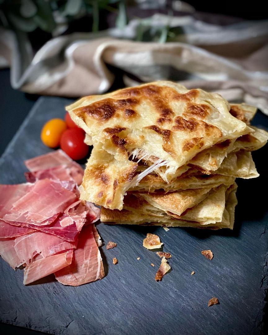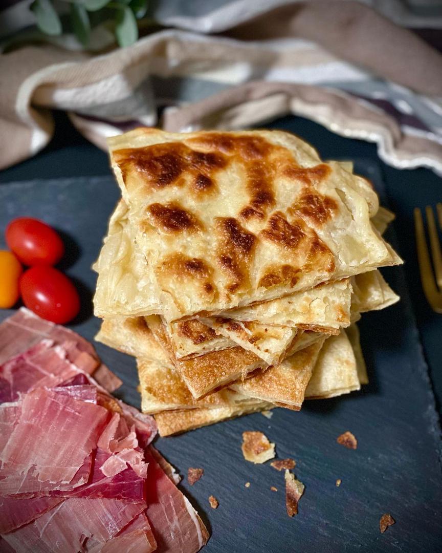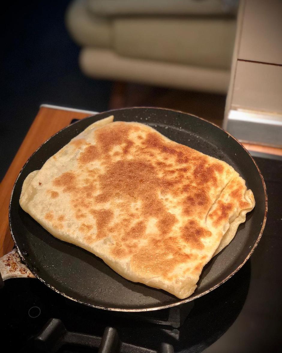 Od svih sastojaka dobro umijesite tijesto, dok ne postane elastično i glatko. Po potrebi dodajte još malo vode ili brašna. Dok mijesite tijesto imajte na umu da svako brašno različito upija tekućinu (čak i od istog proizvođača), zato ga treba dodavati postepeno. Formirajte 4 loptice, premažite ih uljem, pokrijte prozirnom folijom i pustite malo da odmara na sobnoj temperaturi, idealno barem sat vremena. Nauljite radnu plohu pa nauljeno tijesto razvlačite samo rukama, od sredine prema rubovima. Cilj je da dobijete tijesto pravokutnog oblika. Na sredinu razvučenog tijesta stavite naribani sir, zatim sa dvije nasuprotne strane preklopite preko sira trećinu tijesta da dobijete manji pravokutnik od tri sloja. Utisnite nježno rubove da vam nadjev ne bi iscurio. Po želji stavite bilo koji drugi nadjev, npr. onaj za pizzu, špinat, a možete ih peći prazne pa ih onda namazati čokoladnim preljevom. Pripremljene pitice pecite na nauljenoj zagrijanoj tavi nekoliko minuta sa svake strane, dok ne porumene. Prije okretanja nauljite gornju stranu.