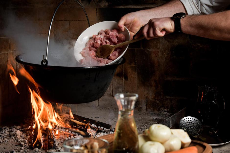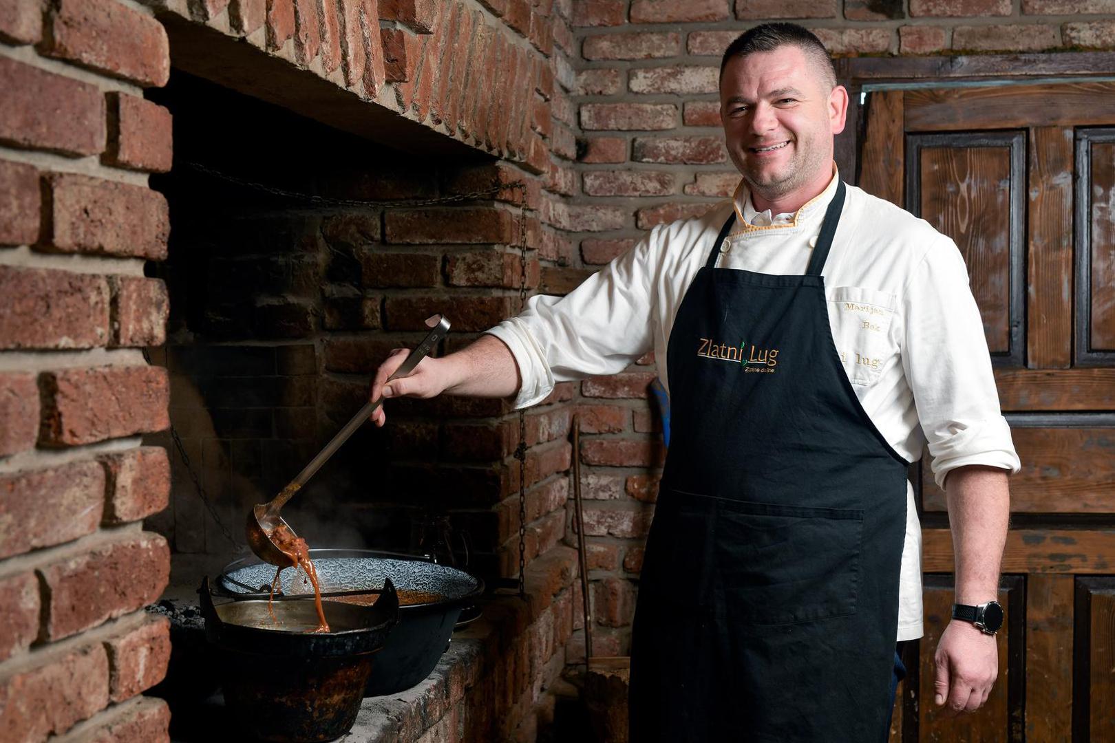 U Zlatnom lugu, jednoj od omiljenih gastronomskih destinacija u Požeško-slavonskoj županiji, čobanac se uvijek kuha utorkom. Kad smo stigli, vatra na ognjištu već je ugodno pucketala, iz kotlića je već mirisala topljena svinjska mast, a svi ostali sastojci potrebni za pripremu ovog slavnog jela već su bili spremni. Stručno nasjeckani luk i korjenasto povrće (Marijan uvijek u čobanac dodaje korijen celera i mrkvu), divljač, junetina, svinjetina, obavezni začini, bokalčić vina i – sušeni vrganji! Zašto vrganji? – U selu Orljavac, gdje sam odrastao, bilo je gljiva kao u priči. Stari ljudi u sva su jela, osim u bistru juhu, dodavali gljive. U čobanac obavezno svježe vrganje, ali sad ih više nema pa koristim sušene. Svaki sokak u selu imao je svoj recept – kaže Marijan koji je već kao trinaestogodišnji klinac pomalo kuhao u lovačkoj kući u Orljavcu gdje je svaki muškarac bio lovac – pa se na kraju odlučio školovati za kuhara. Čim je završio školu, posao ga je odvukao iz Slavonije sve do nekoć slavne Ličke kape na staroj cesti iz Karlovca prema moru, gdje se obavezno zaustavljalo zbog janjetine, ali i tradicionalnih ličkih oblizeka. Tamo je proveo tri godine, zasitio se mesa pa se odlučio spustiti do mora i naučiti nešto i o dalmatinskoj kuhinji. Vratio se Marijan 2006. godine u Slavoniju i otad traje njegova priča s obitelji Pandžić. Sve je faze prošao, a od 2011. glavni je kuhar u restoranu Zlatni lug ili, kako on kaže, od nultoga dana. – Krenuli smo u vrijeme kad ugostiteljstvo baš i nije bilo u cvatu, nakon recesijskih godina, s malim restorančićem, a danas smo jedan od vodećih u županiji. Zadnje dvije godine smo na listi 100 najboljih restorana Hrvatske. Kapacitet povećavamo, a kvaliteta kod nas raste s kapacitetom – kaže Marijan i šali se kako su posao ovdje pokrenuli “iz štalice” (prostorija iz koje je sve krenulo zapravo je preuređena štala s prekrasnim detaljima koji podsjećaju na prvobitnu namjenu) i s tri zaposlenika. Sad ih je trideset zaposlenih, a kapacitet restorana je više od 300 sjedećih mjesta.