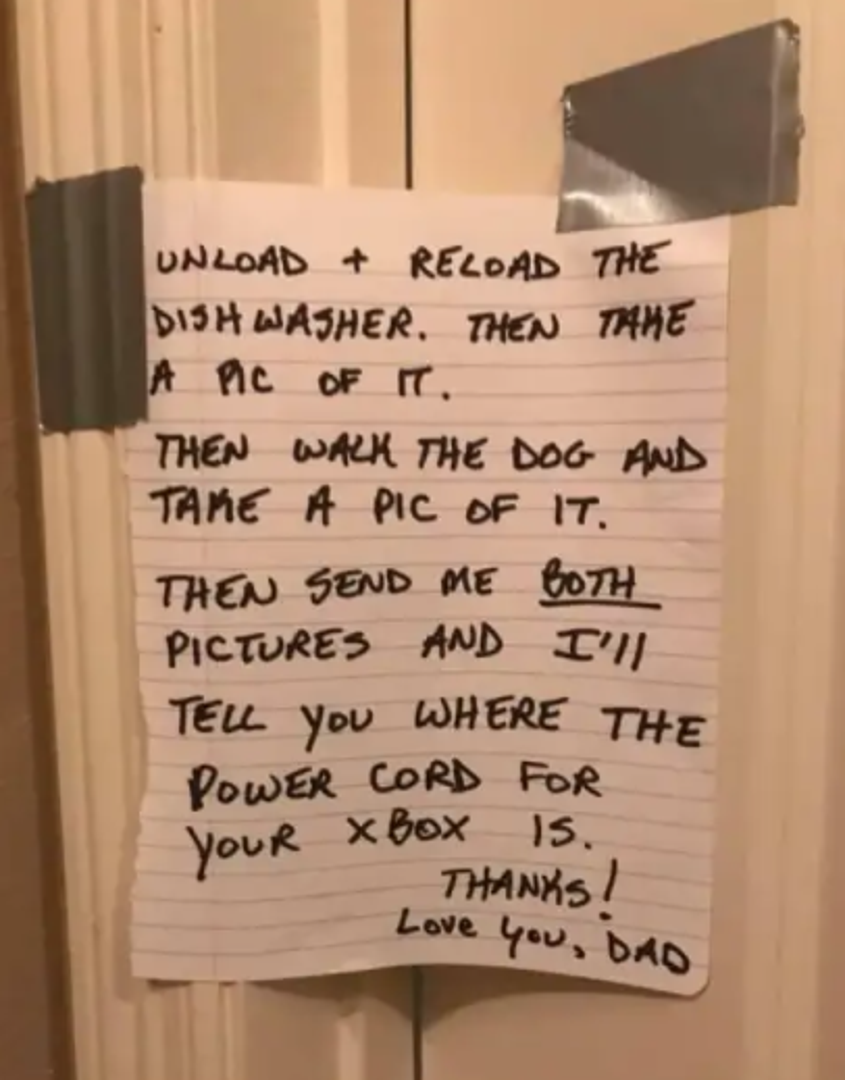 "Izvadite čisto suđe iz perilice i stavite prljavo - fotografirajte obavljeni zadatak. Prošetajte psa - fotografirajte se u šetnji. Pošaljite mi fotografije i onda ću vam reći gdje su vam konzole od Xboxa. Hvala!"