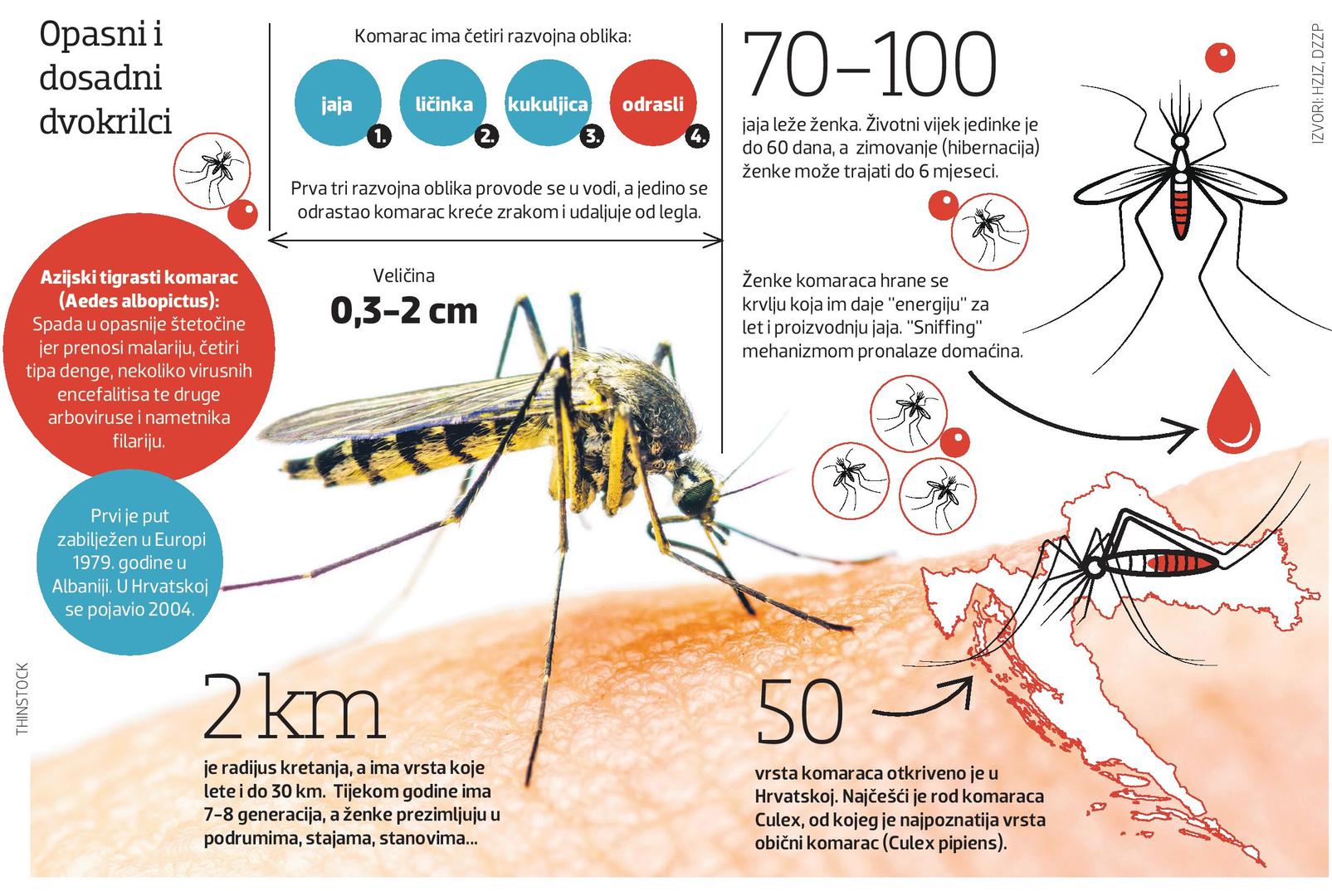 – Danas je prisutan u svim županijama. Prvi put zabilježen je u Zagrebu 2004. i u 13 godina raširio se po cijeloj Hrvatskoj. Puno se teže kontrolira jer je u malim leglima – kaže prof. dr. Enrih Merdić s Odjela za biologiju Sveučilišta J. J. Strossmayera u Osijeku. Njegova kolegica doc. dr. sc. Mirta Sudarić-Bogojević upozorava na važnost kontrole vode u dvorištima, od bačvi, kanti i ostavljenih igračaka do vaza na groblju, jer upravo ta mjesta ženke tzv. urbanih komaraca odabiru za polaganje jaja iz kojih se nakon pet do osam dana razviju dosadni i opasni napasnici. No, neki komarci jaja odlažu i na suhe površine za koje predosjećaju da bi mogle doći u kontakt s vodom. U Osijeku zbog suše trenutačno nema najezde kakve su zabilježene prijašnjih godina. Jajašca poplavnih vrsta komaraca miruju. I čekaju.