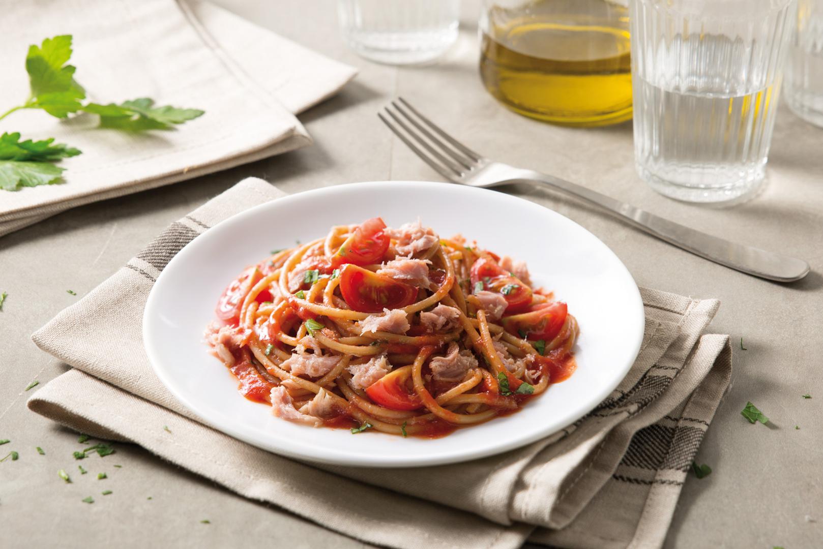 Ocijedite integralne špagete nakon što su se skuhali „al dente“ i prelijte ih umakom Napoletana i tunjevinom.