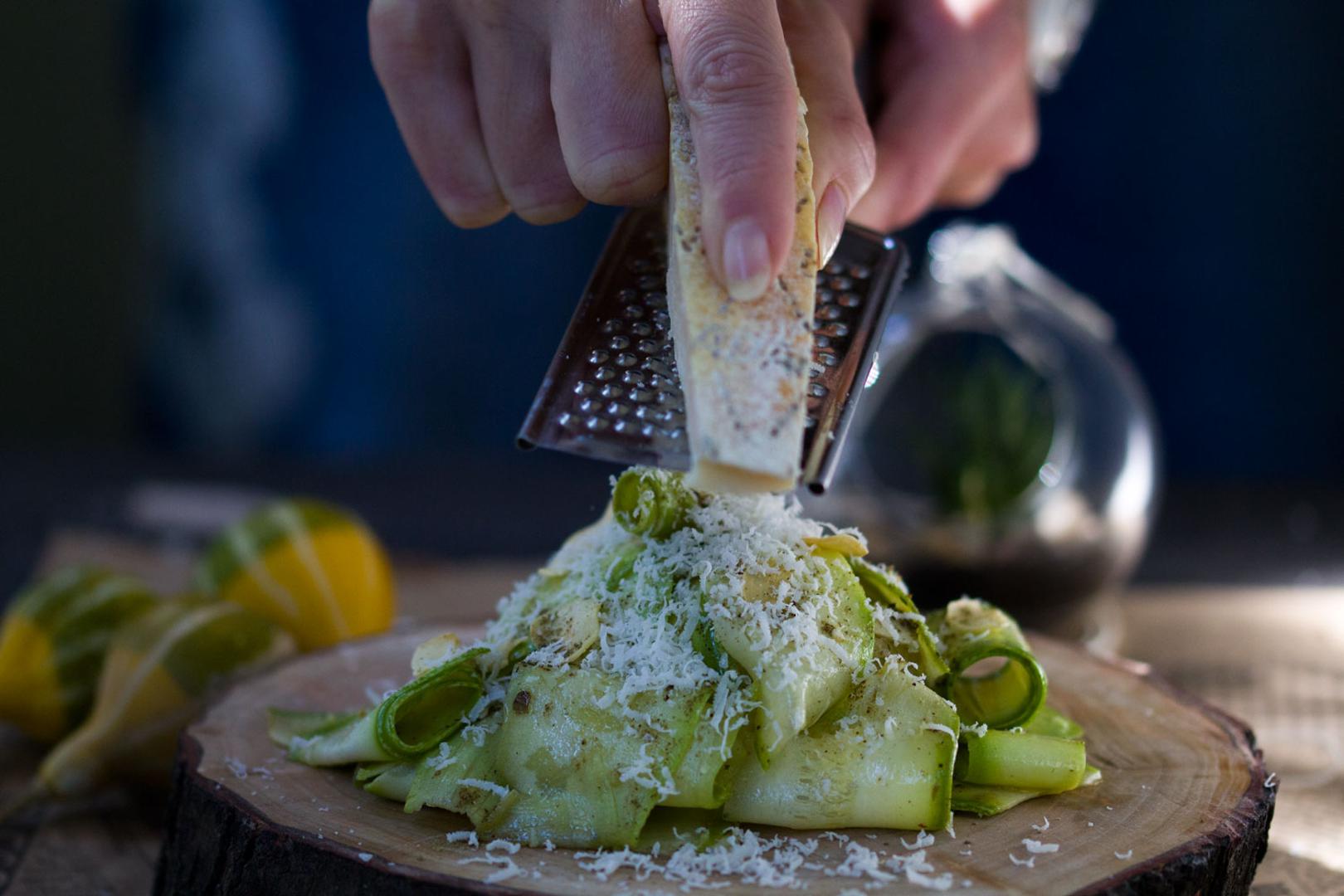 Tikvice ogulite ljuštilicom, a zatim ih istom tom ljuštilicom pažljivo narežite uzdužno na tanke listove. Dodajte ulje, začine, sok od limuna, parmezan i dobro sve promešajte. Salata sjajno ide uz meso ili ribu, a može se jesti kao zdrav obrok uz neki zanimljivi, beskvaksni kruh.