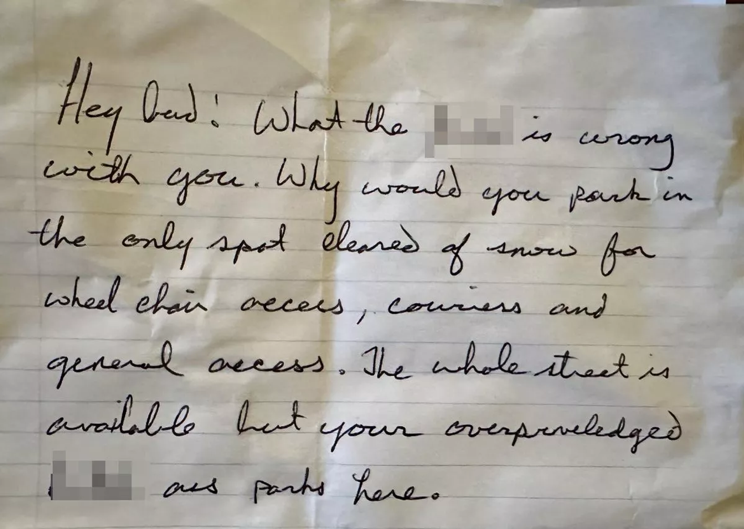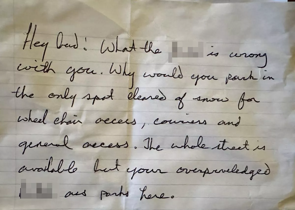 Poruka, koja je objavljena na Redditu, glasila je: ‘Hej! Koji ti je k***c? Zašto bi parkirala na jedinom mjestu očišćenom od snijega za pristup invalidskim kolicima, kuririma i opći pristup? Cijela ulica je dostupna, ali tvoja privilegirana ku***sto d**e parkira ovdje’.