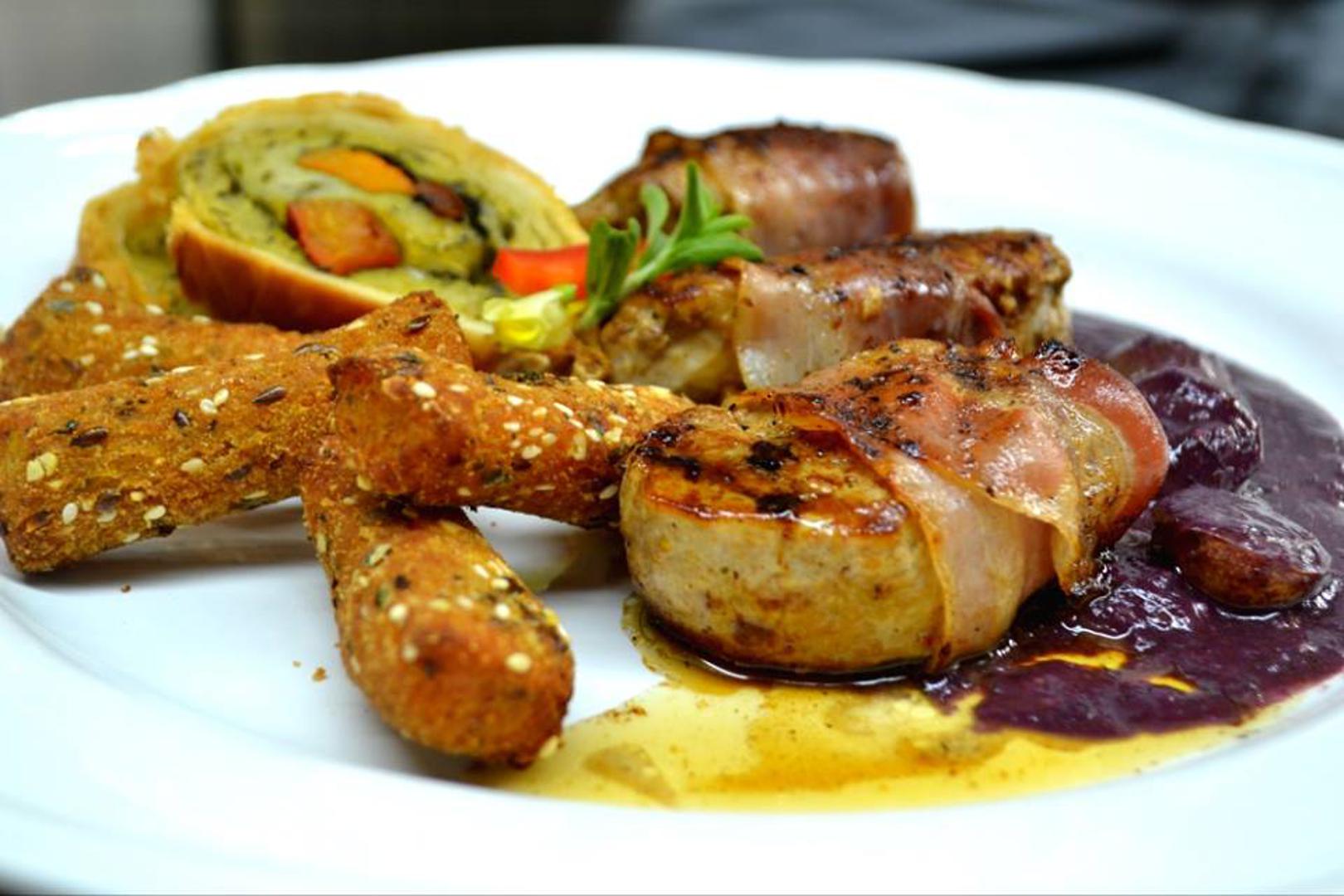 Moram pohvaliti osoblje na ljubaznosti, ali moja mala digresija na uniformiranost osoblja. Uz čašu pjenušca iz sjeverozapadne Hrvatske prepustio sam se sljedovima jela kuhara Božidara Bajsa, Brune Hermana i Darka Šplajta. Za hladno predjelo kušao sam popečenu buču s mladim kozjim sirom i ždrebećim kulenom, brusketu sa svježim kravljim sirom i mesom iz tiblice, dimljena pačja prsa na listovima maslačka s domaćim pekmezom od marelica uz odlični zeleni silvanac.