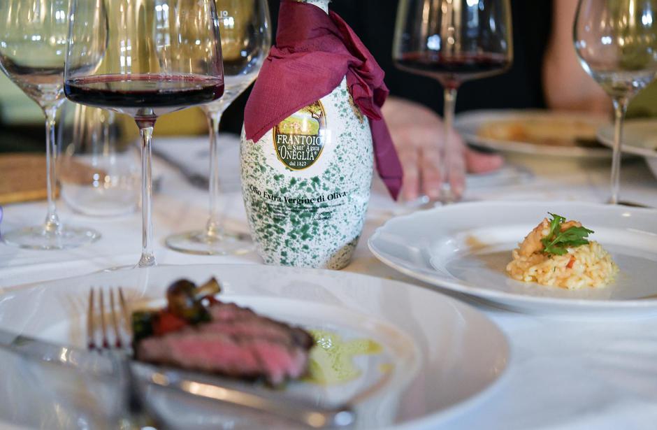 Probali smo od svega pomalo, zadivio nas je namaz od bakalara, fine teksture s odlično pogođenim začinima, zatim delikatan, jako kremasti rižoto s kozicama u kojem je riža bila baš kako treba i besprijekorno pečen biftek poslužen uz povrće s grila, za koje smo zaključili da dugo nismo jeli bolju grilanu papriku, jer je chefu uspjelo da ona ostane savršeno hrskava. Kako se na ručku okupilo žensko društvo, naravno da nismo odoljele desertima, kao ni činjenici da se isti takvi prodaju u londonskom Harrodsu, šoping-meki iz snova svake od nas. Tinu smo nazdravile uz neizbježan crnjak raboso, a dok smo odlazile u rani mrak zimske zagrebačke večeri, činilo nam se da baš on, glasom promuklim od cigareta, za nama poručuje: “Vino razvezuje jezik, daruje blistave govorničke teme, stvara rječitost... U vinu je sveta iskra, jer duh i poezija izlaze iz vina.” Potpisujemo!