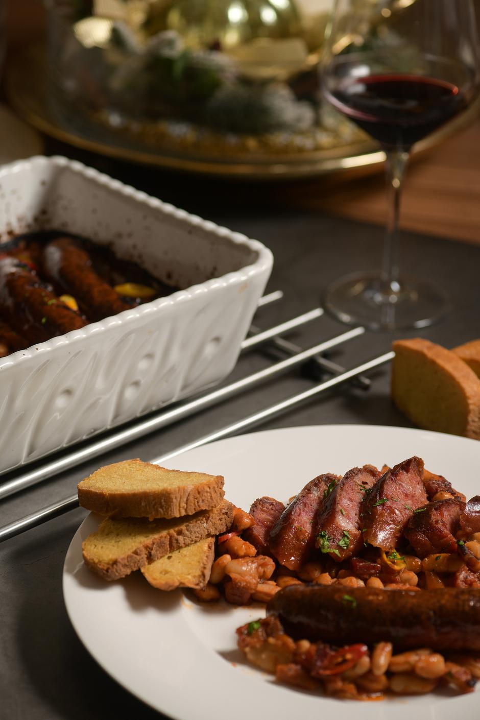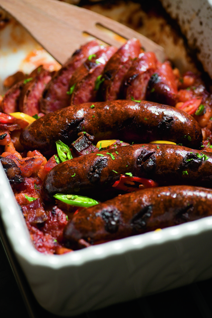 U posudi sjedinite bijeli grah, sjeckanu rajčicu, senf te sol, papar i čili u prahu. Količinu začina prilagodite vlastitom ukusu. U posudu za pečenje stavite smjesu graha i rajčice te povrh toga kobasice koje su prethodno zarezane na nekoliko mjesta kako ne bi pucale zbog visoke temperature. Pospite po svemu sitno sjeckanu slaninu te pecite u zagrijanoj pećnici na 200 stupnjeva 30 minuta. Kada je sve pečeno, dodajte sitno sjeckani list peršina te sitno rezane svježe čili papričice. Poslužite uz kukuruzni kruh.
