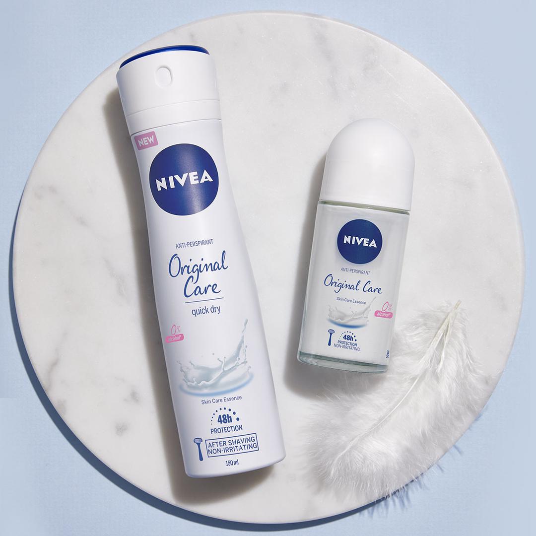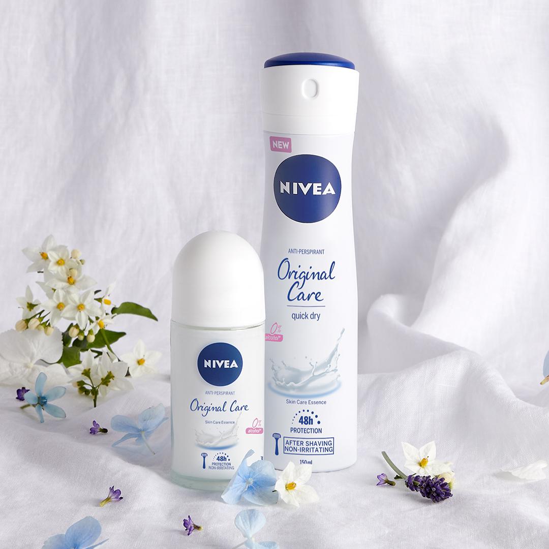 NIVEA Original Care antiperspirant u spreju i roll-onu omogućuje bezbrižnu upotrebu zaštite od znojenja koja traje 48 sati. Zahvaljujući nježnoj formuli bez etilnog alkohola, u trenu možete uživati u baršunasto mekoj koži, čak i nakon depilacije. Jedinstvena formula obogaćena je hranjivom esencijom vitamina i kalcija te osim pouzdane zaštite od neugodnog tjelesnog mirisa, razmazit će vas i svježim mirisom cvijeta naranče.