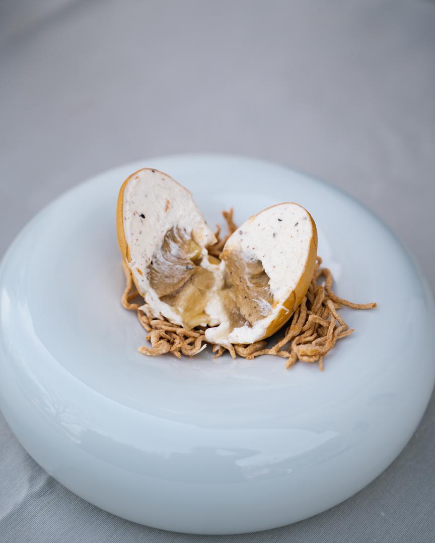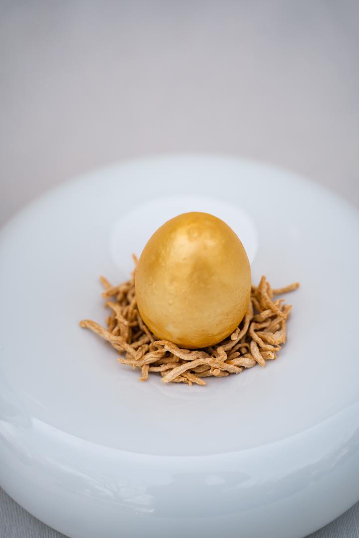 Lisnato tijesto tanko razvaljajte te narežite na sitne trakice. Trakice pecite na 170 stupnjeva dok ne poprime zlatno žutu boju. 200 grama vrhnja zagrijte te dodajte u akiviranu želatinu, bijelu čokoladu i bademe. Štapnim mikserom razradite smjesu te dodajte ostatak vrhnja. Smjesu pustite preko noći da odstoji te ju dan nakon razradite mikserom do željene konzistencije. 70 grama šećera pretvorite u karamelu te izlijte u pleh i pustite da se ohladi. Dodajte lješnjake te miksajte dok se smjesa ne pretvori u pastu. Sok od jabuke zagrijte na laganoj vatri s malo šećera te agar-agarom. Čekajte dok smjesa ne provrije te maknite s vatre i pustite da odmori. Štapnim mikserom pretvorite u željenu konzistenciju te dodajte kockice sitno nasjeckane jabuke. Okrugli kalup napunite gelom od jabuke i pastom od lješnjaka. Zaledite. Dodajte u drugi kalup prethodno napunjenom kremom od bijele čokolade i badema. Zaledite. Umočite u otopinu cacao maslaca i bijele čokolade te kistom nanesite zlatni sloj. Servirajte.
