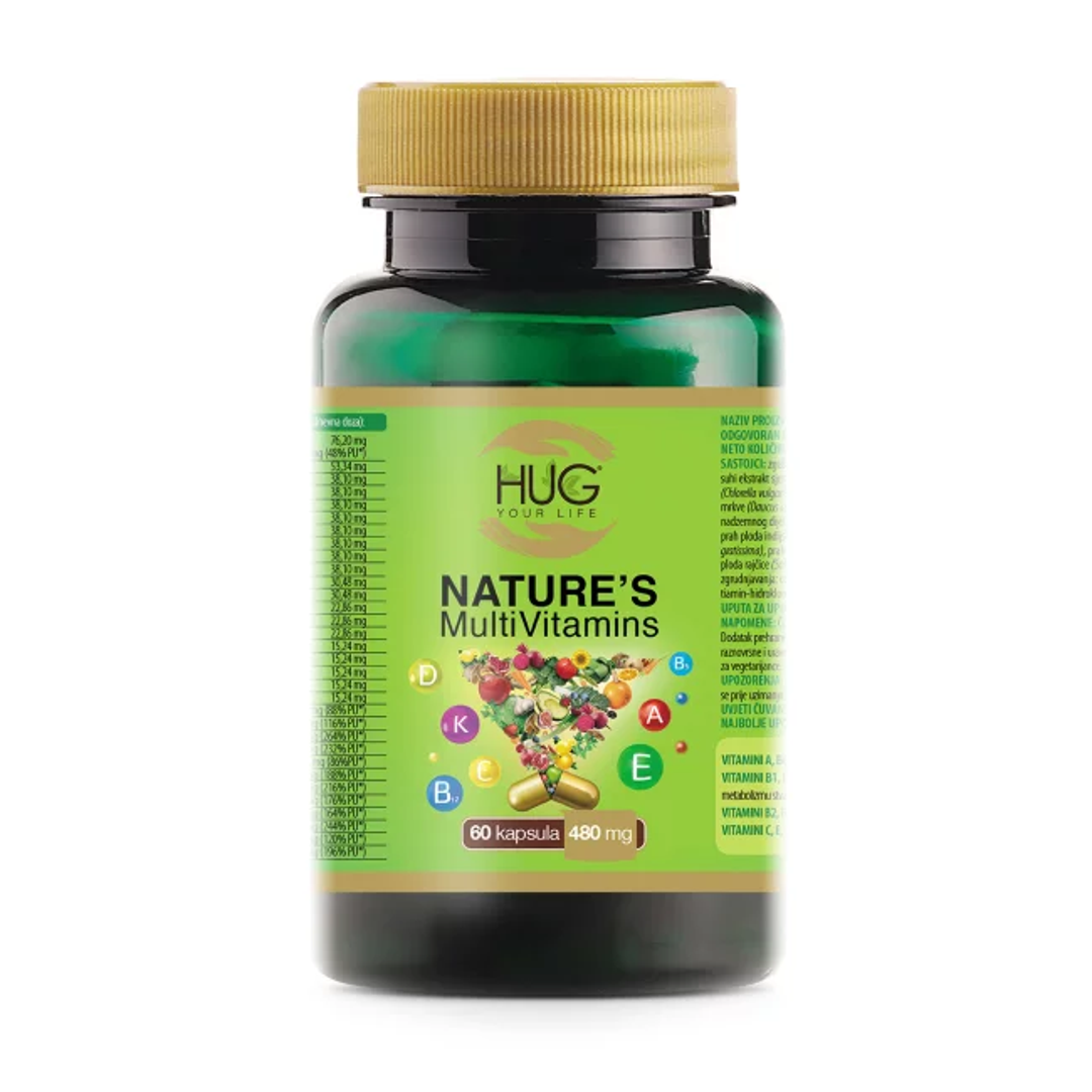 Vitaminizirajte se i osnažite imunitet uz sinergijsko djelovanje 20 biljaka i 13 vitamina uz Hug Your Life NATURE’S MultiVitamins, koji spaja najbolje iz prirode. Bogat je prirodnim izvorima vitamina iz pomno biranih biljaka koji djeluju blagotvorno na cijeli organizam