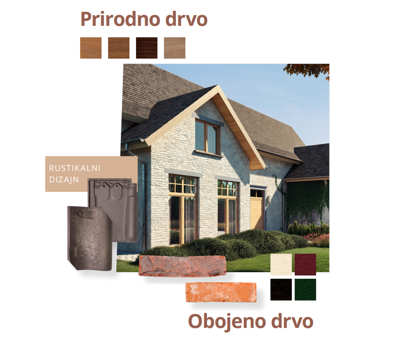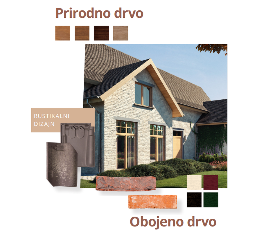 - Ruralni stil - ovdje su istaknute teksture prirodnog i obojenog drva u toplim tonovima. Savršeno se uklapaju s karakterom kuća u područjima izvan gradske vreve i uključuju prirodne boje drva za tradicionalni stil gradnje i boje obojenog drva koje predstavljaju savršenu simbiozu između tradicionalnog i modernog stila.