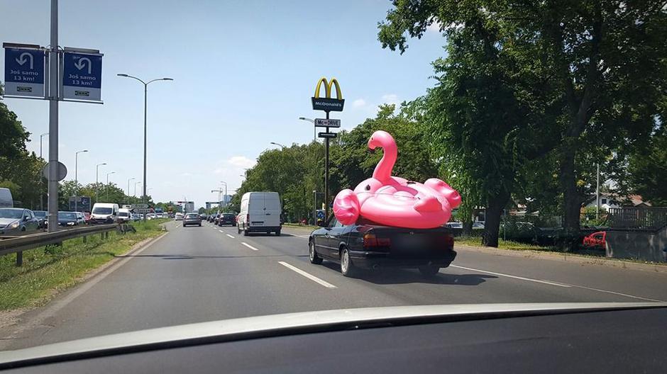 Brojne je korisnike Facebooka nasmijala situacija sa zagrebačke Slavonske avenije. Jedan je vozač za svoj automobil zavezao ogromnog flaminga na napuhavanje i tako se vozio. Milan Žitković uspio je uloviti fotografiju koja je u kratkom roku prikupila preko tisuću lajkova, a u komentarima su mnogi tagirali svoje prijatelje kojima predlažu da bi i oni ovako mogli.