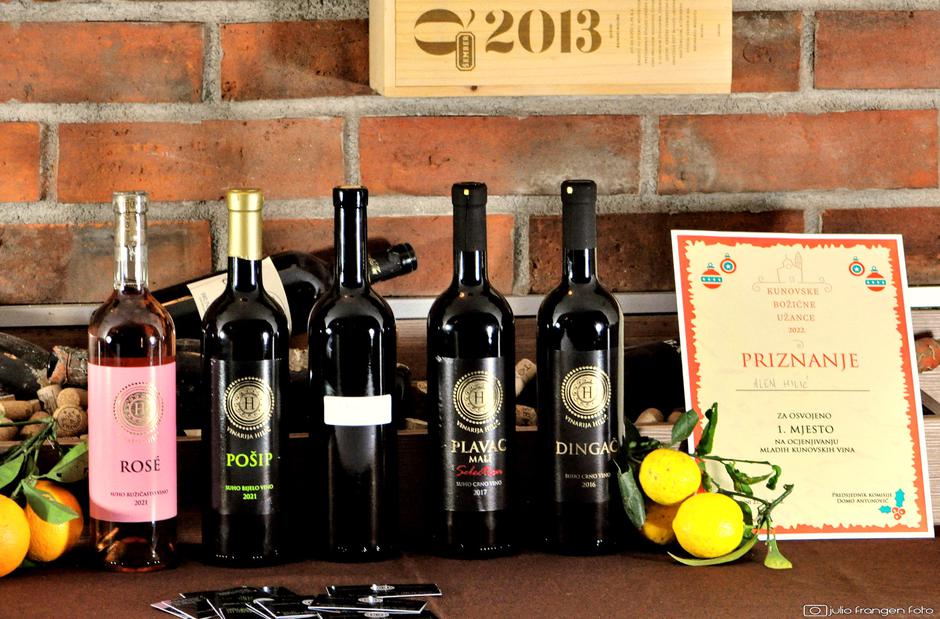 Kada probate njegovog starijeg 'brata', pošip iz 2021. vidite prema kuda bi moglo otići, a to je prema istanutoj strukturiranosti, punoći te ćišćoj i jačoj aromatici. Samo je razlika što u pošipu iz 2021. ima i grožđa iz Kune. Od grožđa plavca maloga s nižih položaja, terasastih vinograda kod Janjine, Rosé 2021. I oni neskloni ovakvoj vrsti vina mogli bi neočekivano prihvatiti ga jer je dovoljno snažan i pun, vrlo aromatičan te može odgovarati i kaloričnijem zalogaju. No, prava priča stigla je s plavcima. Bila je tu pretpremijera plavca malog 2022. koji je na stol došao iz bačve, a napravljen od grožđa ubranog u 35 godina starom vinogradu u Kuni. Već sada je ovo vino moćno, snažno i aromatično, pa je za promišljati kakvo će biti kada se pojavi na tržištu, odležavat će do 2025. godine. Treba reći kako će biti potrebno i malo sreće tada ga dobiti jer je već proglašeno najbojlim na Kunovskim božićnim užancama, unaprijed je otkupljena već gotovo trećina berbe. Unače su Kunske božićne užance tradicionalan događaj sličan svinjokolji na sjeveru pri kojem se njeguju stari običaji kada se o tome radi.