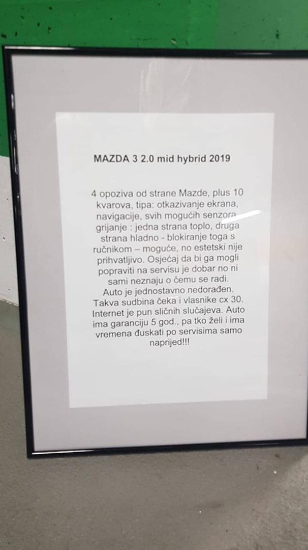 - Četiri opoziva od strane Mazde, plus 10 kvarova poput otkazivanja ekrana, navigacije, senzora za grijanje, jedna strana toplo, druga strana hladno. Blokiranje toga s ručnikom je moguće, ali nije estetski prihvatljivo. Osjećaj da bi ga mogli popraviti na servisu je dobar, no ni oni sami ne znaju o čemu je riječ. Auto je jednostavno nedorađen. Takva sudbina čeka i vlasnike cx30. Internet je pun sličnih slučajeva. Auto ima garanciju pet godina pa tko želi i ima vremena “đuskati” po servisima samo naprijed - napisao je zlovoljni vlasnik.