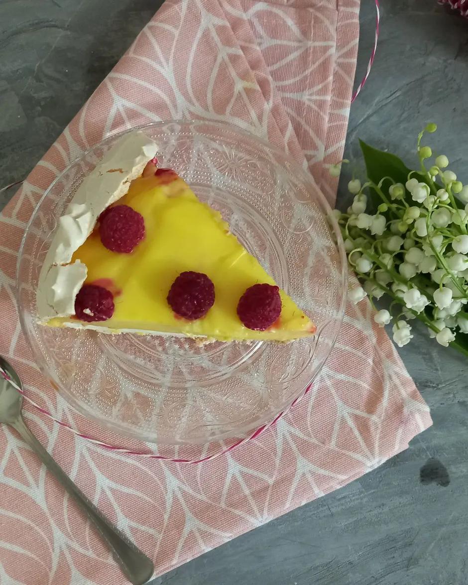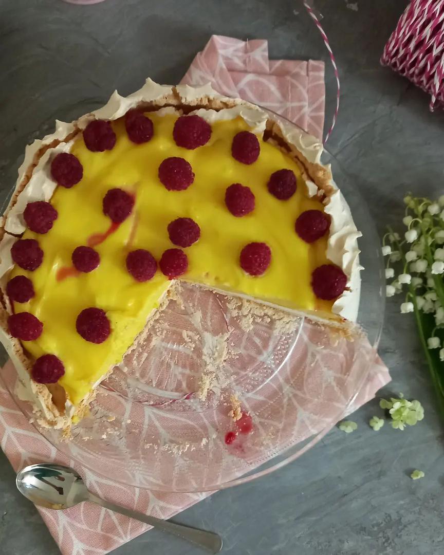 Žumanjke pjenasto umutite, dodajte malo mlijeka i puding pomiješan s gustinom. Preostalo mlijeko zašećerite s pet žlica šećera i stavite da se kuha. Pažljivo dodajte žumanjke s pudingom i kuhajte. Kad je gotovo, odmah u kremu ubacite maslac i ostavite da se ohladi. Kad je nadjev hladan izradite ga mikserom i premažite preko kore. Po nadjevu složite svježe maline ili voće po želji.