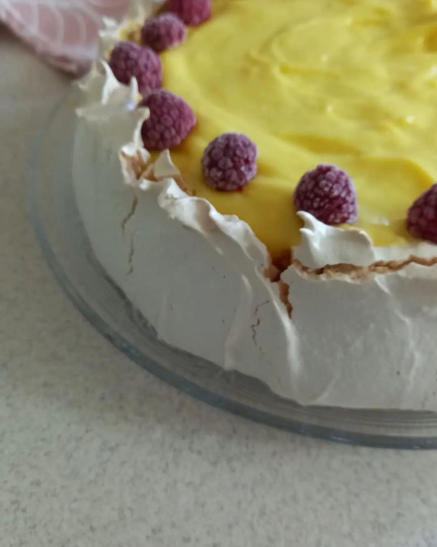 Bjelanjke pjenasto umutite i postupno dodajte šećer. Miksajte otprilike deset minuta da se šećer dobro rastopi i dobijete čvrstu meringu pa u tom trenutku dodajte ocat i žličicu gustina pa još jednom promiješajte na najnižoj brzini. U limu za pečenje formirajte oblik kruga, promjera 22 cm. Pecite na 100 stupnjeva oko sat vremena, ali provjeravajte povremeno jer možda ćete morati sniziti temperaturu ili skratiti vrijeme pečenja, ovisno o pećnici. Kad je gotovo, isključite pećnicu i ostavite koru unutra da se potpuno ohladi.