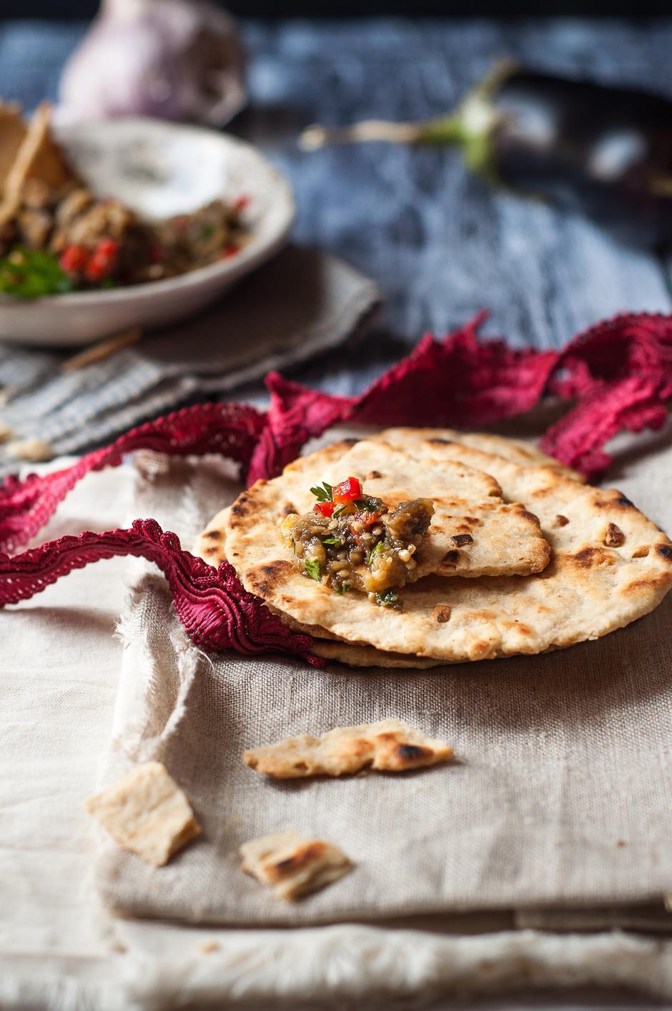 Pomiješajte sve suhe sastojke dok se lijepo ne sjedine. Dodajte maslinovo ulje i postupno dodajte vodu miješajući tijesto. Možete ga mijesiti i mikserom s nastavkom za tijesto. Mijesite dok ne dobijete lijepo formirano tijesto pa ga izvadite iz posude i rukom mijesite otprilike 3 minute dok ne postane mekano i glatko. Pokrijte tijesto i pustite da odstoji 30 minuta. Podijelite tijesto na 4 dijela i svaki dio premažite maslinovim uljem. Ponovno prekrijte i ostavite da odmara još 30 minuta. Zagrijte pećnicu na maksimalnu temperaturu i stavite u nju lim za pečenje. Razvaljajte tijesto na površini posutoj kukuruznim brašnom. Razvaljane kruščiće stavite na vrući lim i pecite 3-4 minute, vilicom probadajući mjehuriće na tijestu. Poslužite odmah ili spremite u plastičnu vrećicu da zadrži svježinu. Ostatke kruha možete jesto sljedeća dva dana, a možete ih čuvati i u zamrzivaču do 3 mjeseca.
