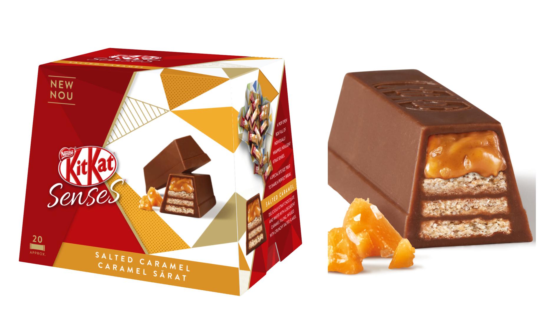 KIT KAT Senses Slana karamela i KIT KAT Senses Lješnjak odlikuju se pomno odabranim sastojcima, ukusnom čokoladom, hrskavim vafelom i raskošnim kremastim punjenjem te će zasigurno razveseliti mnoge čokoljupce. KIT KAT Senses Slana karamela posebna je jer sadrži zrnca soli, dok KIT KAT Senses Lješnjak sadrži punjenje s prženim komadićima lješnjaka.