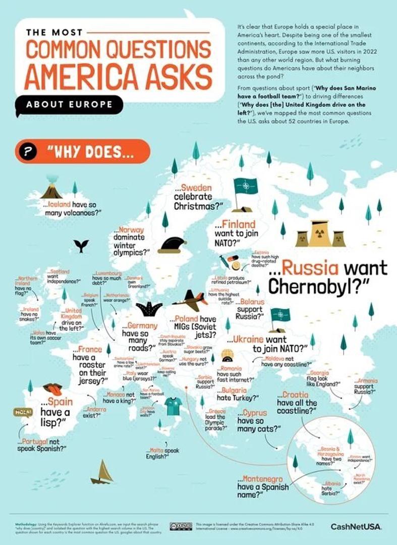 O Njemačkoj je Amerikance najviše zanimalo zašto ima toliko puno cesta, dok su se za Francusku pitali: „Zašto imaju pijetla na dresu?“. Zanimalo ih je i zašto Bugarska mrzi Tursku te zašto Bjelorusija i Armenija podupiru Rusiju. Kod Velike Britanije nepoznanica im je bila zašto voze s lijeve strane ceste, a kod Švedske zašto slave Božić.