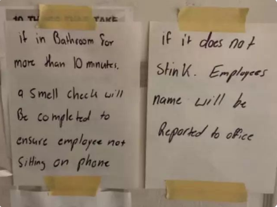 Oznaka u toaletu se brzo proširila Twitterom, a upozorava zaposlenike ako su na wc-u duže od 10 minuta, netko kreće u "smell check". Od svih pitanja, netko je komentirao najbolje - "Zanima me samo, tko je sretnik koji će obilaziti wc?"