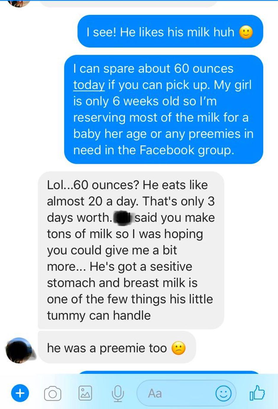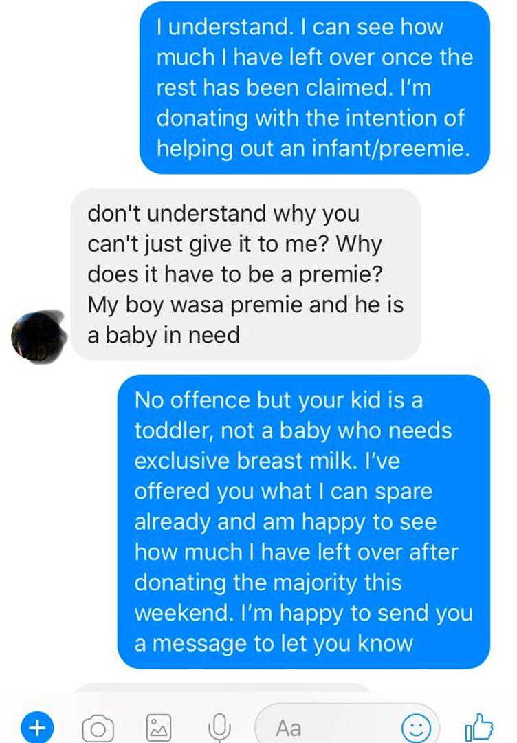 Ljutita majka dječaka počela je nakon toga vrijeđati majku koja joj je bila voljna pokloniti svoje izdojeno mlijeko, rekavši joj da bi trebala njeno mlijeko dati za njenog sina, zašto je bitno da to bude prerano rođeno beba? Uopstalom, i njen je sin jednom bio prerano rođena beba, napisala joj je. Nakon što je majka djevojčice odgovorila da je njeno dijete ipak starije i ne ovisi o izdojenom mlijeku, majka dječaka prozvala ju je k**** i napisala joj da je "njeno mlijeko ionako vjerojatno prepuno alkohola i antibiotika i da su "jadna djeca" koja će njeno mlijeko piti."