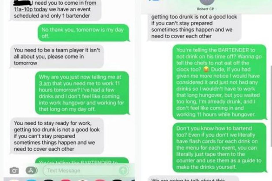 U postu na Redditu, sada bivši barmen, objavio je niz poruka koje je razmijenio sa svojim poslodavcem, koji je čekao do 3 sata ujutro kako bi rekao svom zaposleniku da treba doći na smjenu na poslu za svega osam sati.