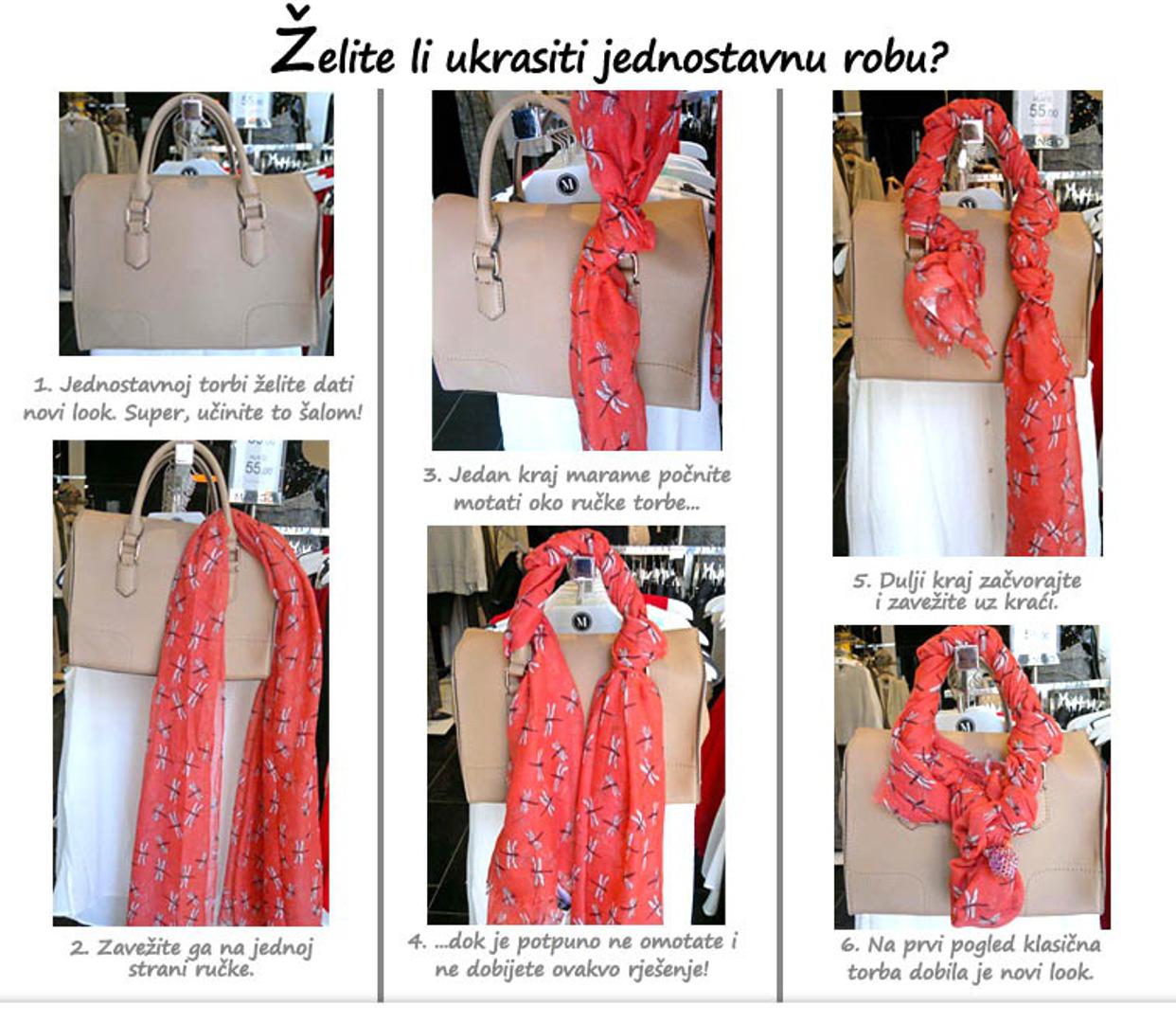 I za kraj…Po kojem principu kupujete torbicu? Kupite jednu, klasičniju koja pristaje na sve kombinacije. No, i takva jednostavnost može ponekad dosaditi. Želite li osvježiti svoju dragu, ali jednostavnu torbu napravite to uz pomoć marame kojom ćete omotati jednu ručku.