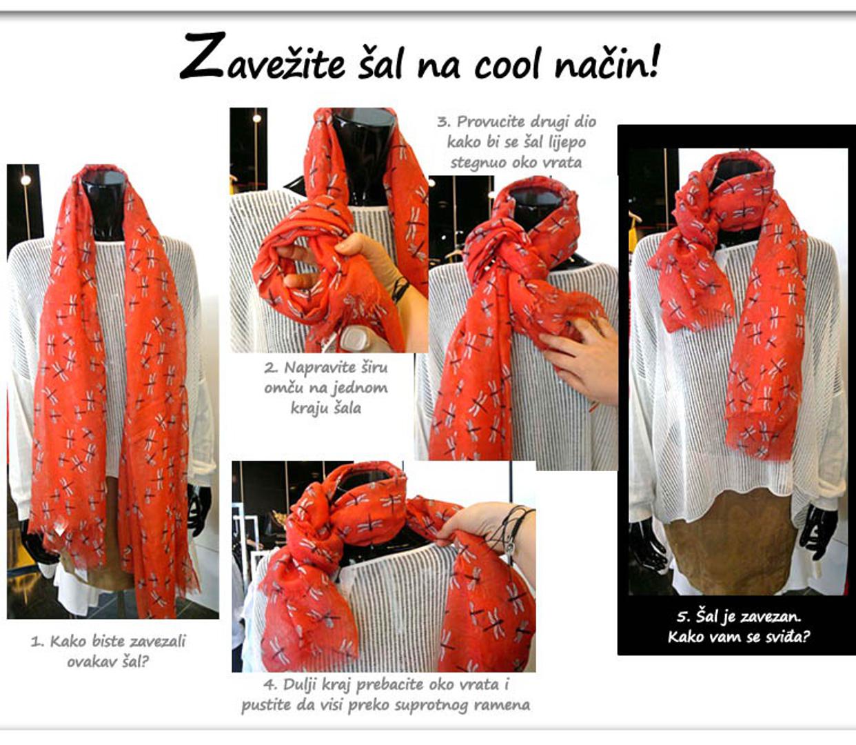 Nosite li dekoltirane majice ili tunike naučite zavezati šal kako bi se prekrio dekolte, ali ne povećao gornji dio tijela. Kako to napraviti? Dovoljno je pripremiti jedan lijepi prozračan šal koji neka bude od prirodne tkanine kako se ne bi pojačavalo znojenje. Boju šala prvenstveno uskladite s bojom puti, kose i očiju i to po ovom principu: uz toplu boju puti pristaju i tople šare na šalu, dok ženama svijetle boje puti (bjelkast sjaj), kose i očiju pristaju hladne nijanse na šalu. Tek kad ste pronašli idealan detalj koji vašem licu daje svježinu kombinirajte ga uz odjeću.
