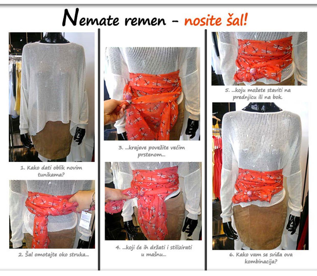 Ove su sezone moderne jednostavne forme, poput tunika ili pulovera četvrtastog oblika. Želite li naglasiti obline, umjesto remena oko struka zavežite šal. Odaberete li prozračnu tkaninu ovakav detalj neće pojačati liniju struka već cijeloj modnoj priči staviti točku na 'I'. Kako je u ovoj priči šal postao remen za njega vrijedi isto pravilo kao i sa kožnim remenom - treba se uskladiti s cipelama i torbicom.
