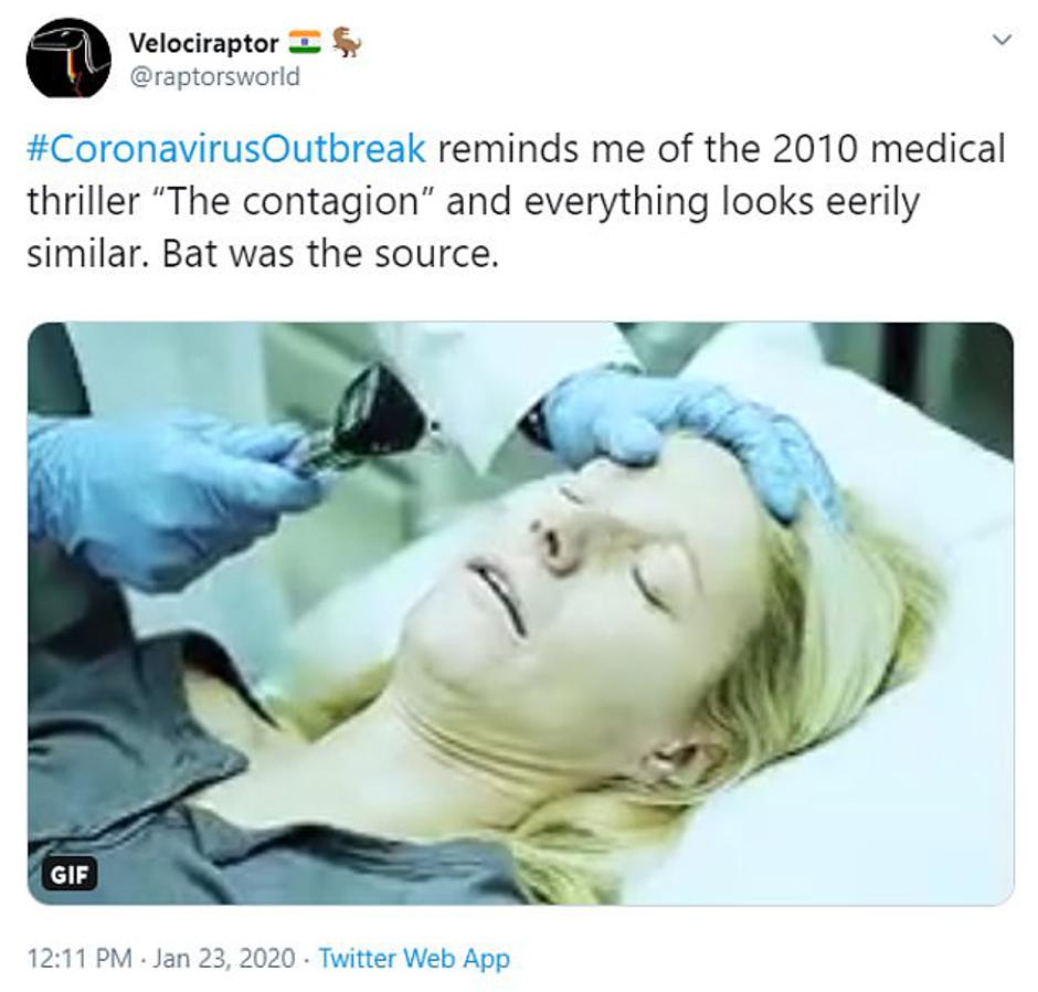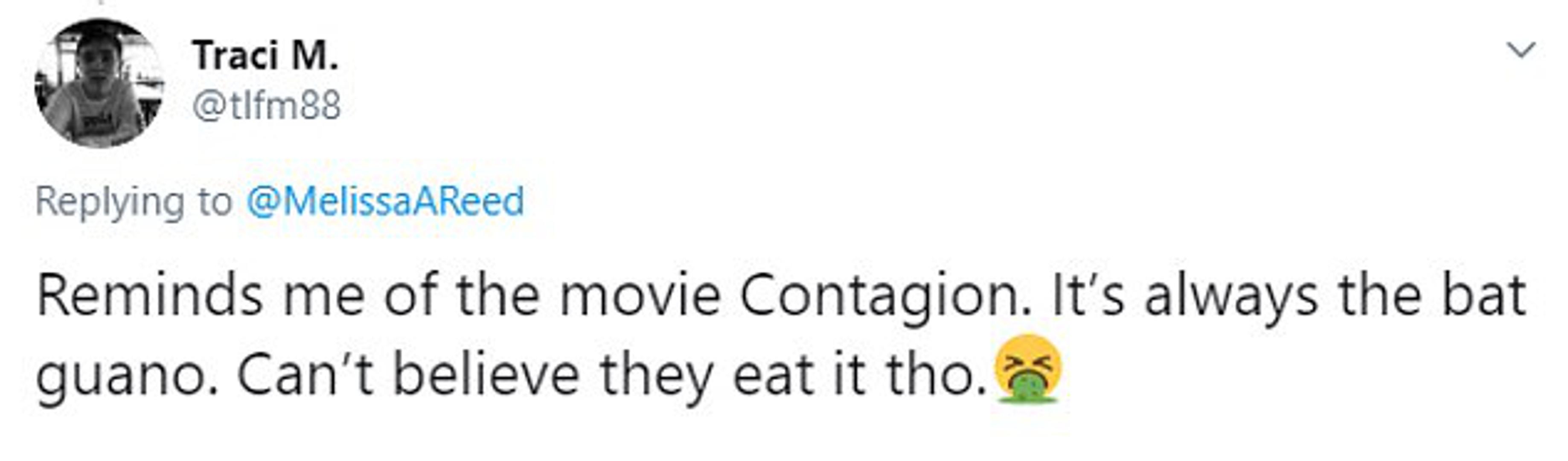 "Film se događa u stvarnom životu!!!", zaključio je jedan twitteraš. "Sve me podsjeća na film Contagion. Ne mogu vjerovati da jedu šišmiše...", piše korisnik.