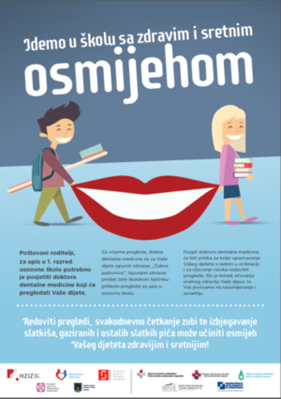 Organizatori programa su Ministarstvo zdravstva i Hrvatski zavod za javno zdravstvo u suradnji s Hrvatskim zavodom za zdravstveno osiguranje, Hrvatskom komorom dentalne medicine (HKDM), Hrvatskom liječničkom komorom (HLK) i zavodima za javno zdravstvo jedinica područne (regionalne samouprave). Važna je i podrška Ministarstva znanosti i obrazovanja te županijskih ureda nadležnih za zdravstvo i obrazovanje. Osnovni provoditelji programa su doktori odnosno timovi školske medicine i dentalne medicine.