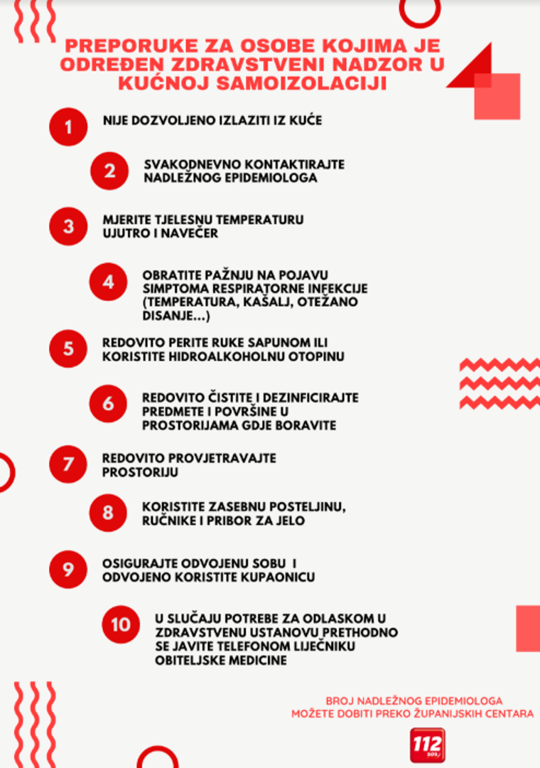 10. U slučaju potrebe za odlaskom u zdravstvenu ustanovu, prethodno se javite telefonom liječniku obiteljske medicine ili nadležnom epidemiologu.